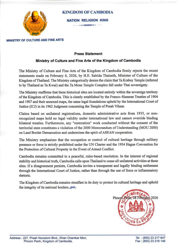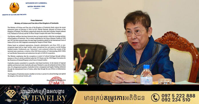 ភ្នំពេញ ៖ ក្រសួងវប្បធម៌ និងវិចិត្រសិល្បៈនៃព្រះរាជាណាចក្រកម្ពុជា សូមបដិសេធយ៉ាងដាច់អហង្ការចំពោះសេចក្តីថ្លែងការណ៍ថ្មីៗដែលបានធ្វើឡើងនៅថ្ងៃទី 6 ខែកុម្ភៈ ឆ្នាំ 2026 ដោយលោកស្រី Sabida Thaiseth រដ្ឋមន្ត្រីក្រសួងវប្បធម៌នៃព្រះរាជាណាចក្រថៃ។ ក្រសួងសូមបដិសេធយ៉ាងដាច់អហង្ការចំពោះការអះអាងថា ប្រាសាទតាក្របី (ដែលប្រទេសថៃហៅថា តាក្វៃ) និងប្រាសាទតាមាន់ ស្ថិតនៅក្រោមអធិបតេយ្យភាពរបស់ប្រទេសថៃ។