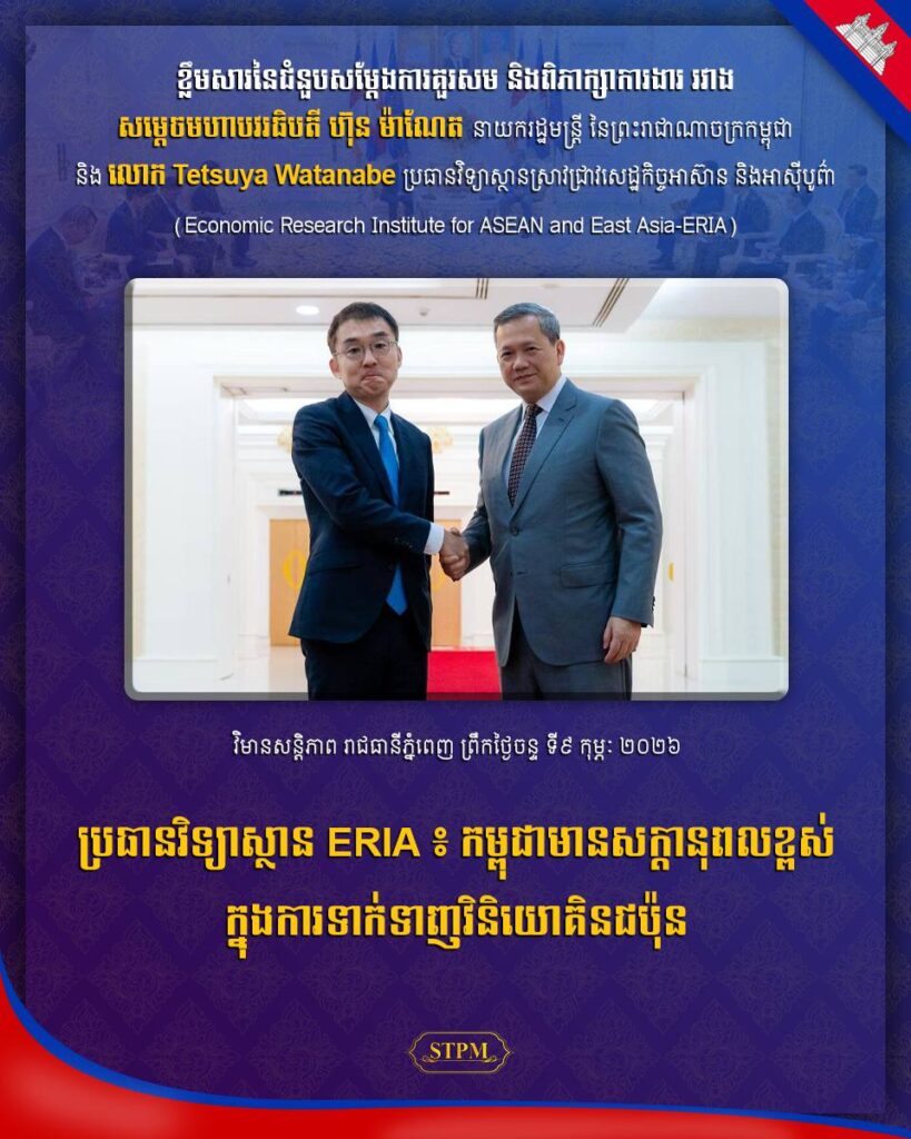 ភ្នំពេញ ៖ នាព្រឹកថ្ងៃទី៩ ខែកុម្ភៈ ឆ្នាំ២០២៦ សម្ដេចមហាបវរធិបតី ហ៊ុន ម៉ាណែត នាយករដ្ឋមន្ត្រី នៃព្រះរាជាណាចក្រកម្ពុជា បានអនុញ្ញាតឱ្យលោកសាស្ត្រាចារ្យ តេតស៊ូយ៉ា វ៉ាតាណាបេ (Tetsuya WATANABE) ប្រធានវិទ្យាស្ថានស្រាវជ្រាវសេដ្ឋកិច្ចសម្រាប់កិច្ចការអាស៊ាន និងអាស៊ីបូព៌ា (ERIA) ចូលជួបសម្ដែងការគួរសម និងពិភាក្សាការងារ នៅវិមានសន្ដិភាព។