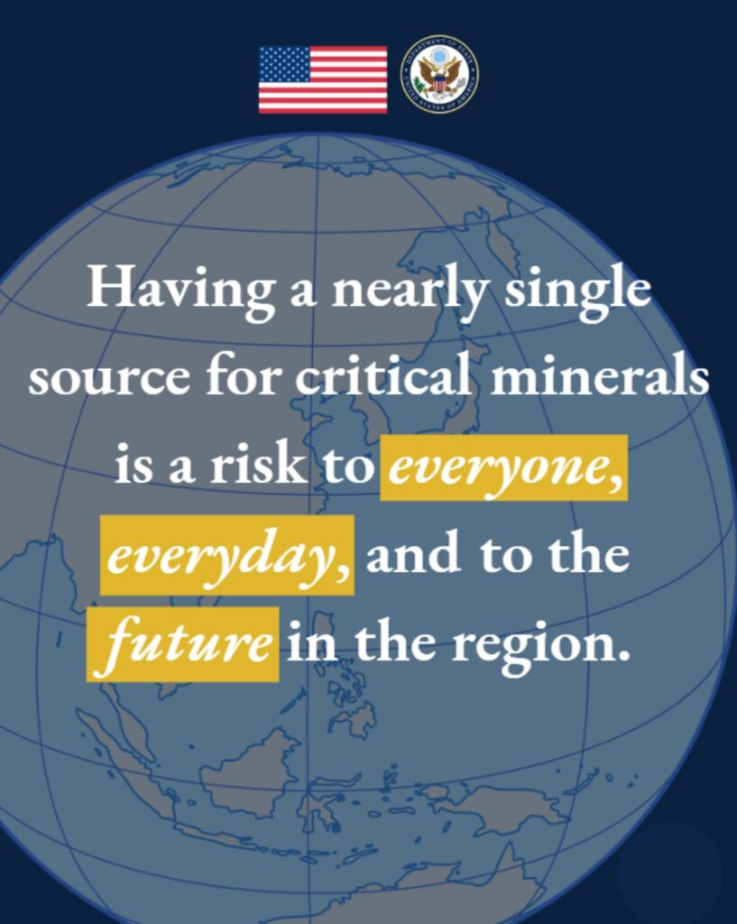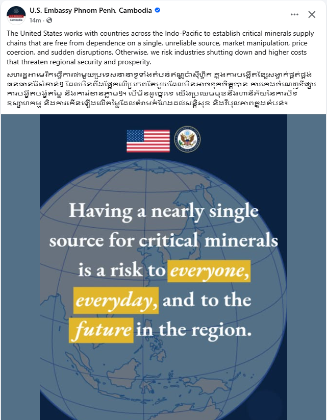 ភ្នំពេញ ៖ ស្ថានទូតសហរដ្ឋអាមេរិកប្រចាំកម្ពុជា នៅថ្ងៃទី១០ខែកុម្ភៈឆ្នាំ២០២៦នេះ បានចេញផ្សាយព័ត៌មានថា សហរដ្ឋអាមេរិកធ្វើការជាមួយប្រទេសនានាទូទាំងតំបន់ឥណ្ឌូប៉ាស៊ីហ្វិក ក្នុងការបង្កើតខ្សែសង្វាក់ផ្គត់ផ្គង់ធនធានរ៉ែសំខាន់ៗ ដែលមិនពឹងផ្អែកលើប្រភពតែមួយដែលមិនអាចទុកចិត្តបាន ការកេងចំណេញទីផ្សារ ការបង្ខិតបង្ខំតម្លៃ និងការរំខានភ្លាមៗ។