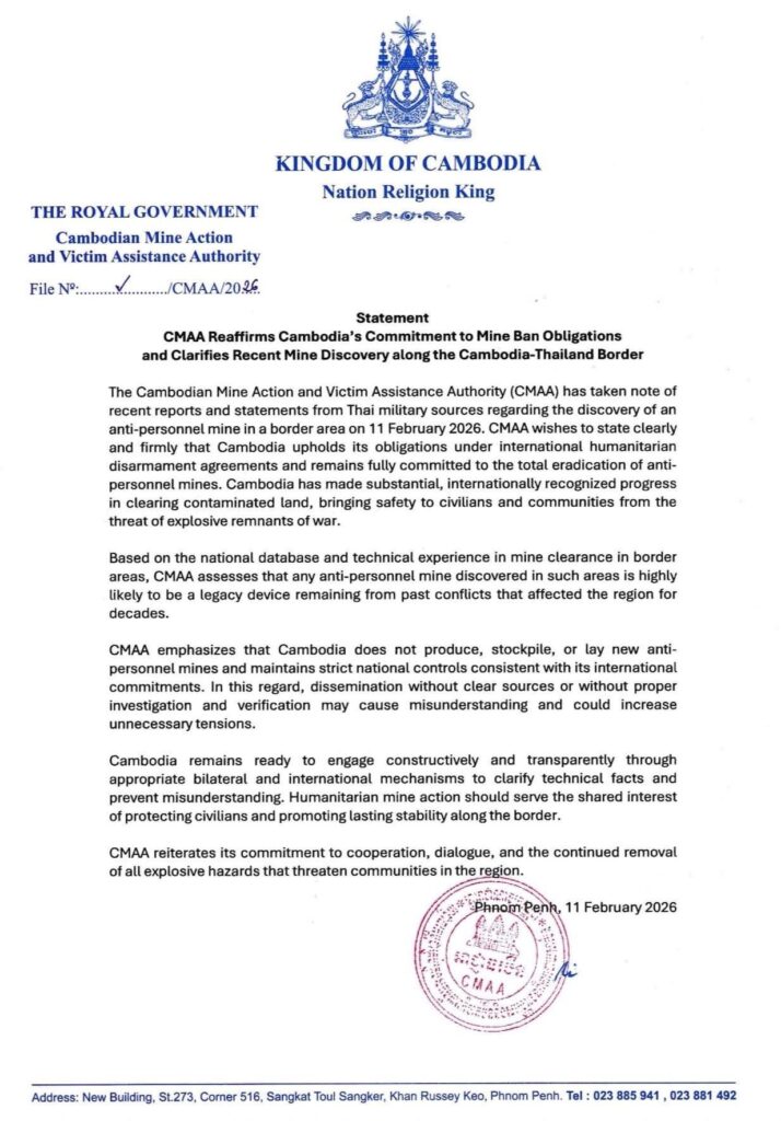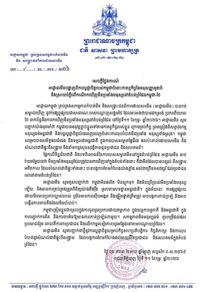 រាជធានីភ្នំពេញ ៖ អាជ្ញាធរកម្ពុជា គ្រប់គ្រងសកម្មភាពកំចាត់មីន និងសង្គ្រោះជនពិការដោយសារមីន (អាជ្ញាធរមីន) បានកត់ សម្គាល់ឃើញ នូវការផ្សព្វផ្សាយជាសាធារណៈរបស់បណ្ដាញសង្គមថៃ ដែលអះអាងថាបានដកស្រង់ ប្រភពពីយោធា ថៃ ពាក់ព័ន្ធនឹងការរកឃើញមីនប្រឆាំងមនុស្សនៅតំបន់ព្រំដែន នៅថ្ងៃទី១១ ខែកុម្ភៈ ឆ្នាំ២០២៦។ នេះបើតាមសេចក្តីថ្លែងការរបស់អាជ្ញាធរមីននៅថ្ងៃទី ១១ ខែកុម្ភៈ ឆ្នាំ២០២៦។