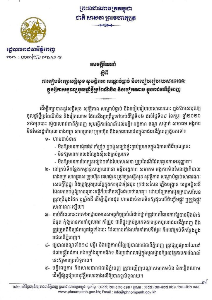 ដើម្បីរក្សាបាននូវសន្តិសុខ សុវត្ថិភាព សណ្តាប់ធ្នាប់ និងរបៀបរៀបរយសាធារណៈ ក្នុងឱកាសបុណ្យ ចូលឆ្នាំថ្មីប្រពៃណីចិន និងវៀតណាម ដែលនឹងប្រព្រឹត្តទៅចាប់ពីថ្ងៃទី១៦ ដល់ថ្ងៃទី១៩ ខែកុម្ភៈ ឆ្នាំ២០២៦ ខាងមុខនេះ រដ្ឋបាលរាជធានីភ្នំពេញ សូមធ្វើការណែនាំដល់មន្ទីរ អង្គភាព ខណ្ឌ សង្កាត់ សមាគម អង្គការ មិនមែនរដ្ឋាភិបាល រោងចក្រ សហគ្រាស ក្រុមហ៊ុន និងសាធារណជនក្នុងរាជធានីភ្នំពេញដូចតទៅ៖