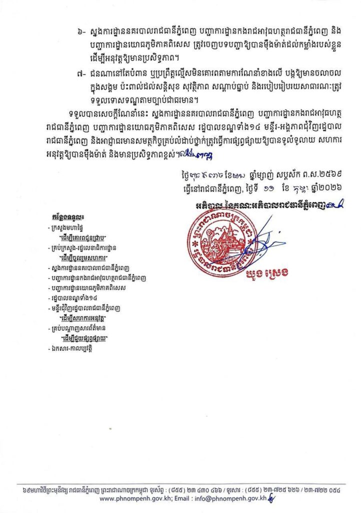 ទទួលបានសេចក្ដីណែនាំនេះ ស្នងការដ្ឋាននគរបាលរាជធានីភ្នំពេញ បញ្ជាការដ្ឋានកងរាជអាវុធហត្ថ រាជធានីភ្នំពេញ បញ្ជាការដ្ឋានយោធភូមិភាគពិសេស រដ្ឋបាលខណ្ឌទាំង១៤ មន្ទីរ-អង្គភាពជុំវិញរដ្ឋបាល រាជធានីភ្នំពេញ និងអាជ្ញាធរមានសមត្ថកិច្ចគ្រប់លំដាប់ថ្នាក់ត្រូវធ្វើការផ្សព្វផ្សាយឱ្យបានទូលំទូលាយ សហការ អនុវត្តឱ្យបានម៉ឺងម៉ាត់ និងមានប្រសិទ្ធភាពខ្ពស់៕ រក្សាសិទ្ធដោយ៖សុទ្ធលី
