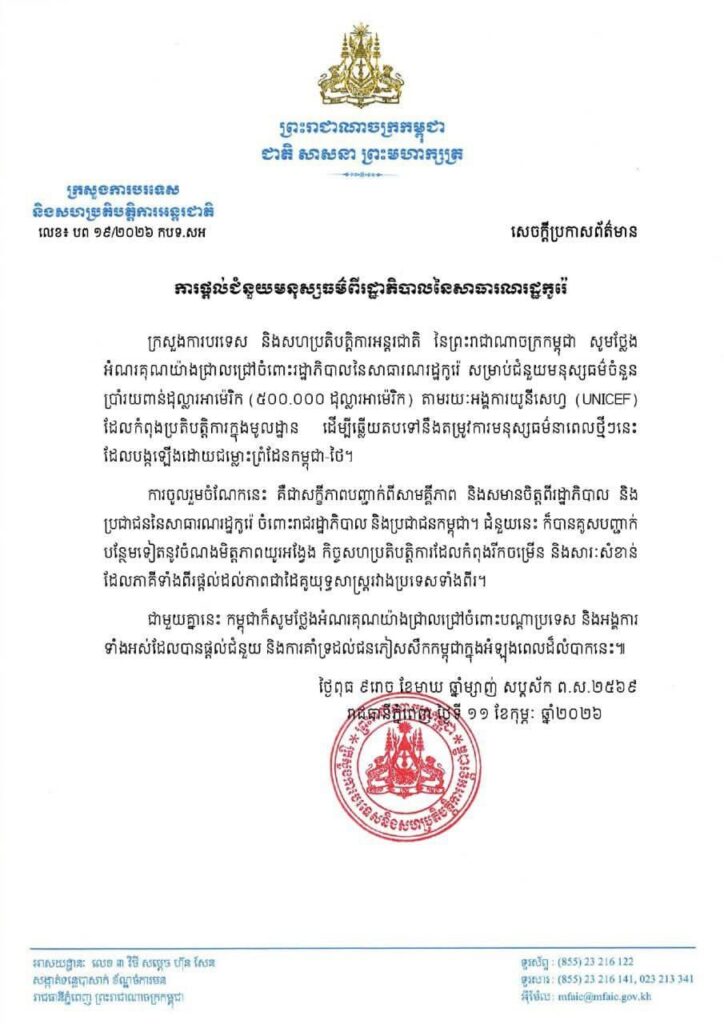 ក្រសួងការបរទេស និងសហប្រតិបត្តិការអន្តរជាតិ នៃព្រះរាជាណាចក្រកម្ពុជា សូមថ្លែង អំណរគុណយ៉ាងជ្រាលជ្រៅចំពោះរដ្ឋាភិបាលនៃសាធារណរដ្ឋកូរ៉េ សម្រាប់ជំនួយមនុស្សធម៌ចំនួន ប្រាំរយពាន់ដុល្លារអាម៉េរិក (៥០០.០០០ ដុល្លារអាម៉េរិក) តាមរយៈអង្គការយូនីសេហ្វ (UNICEF)