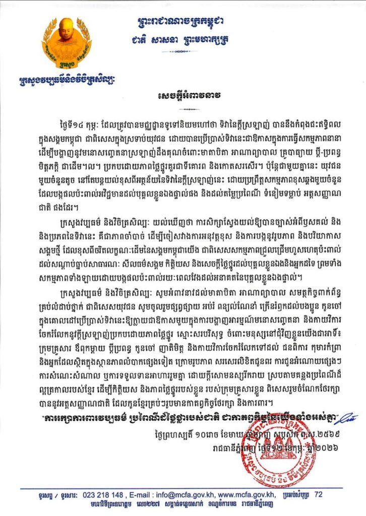 ភ្នំពេញ ៖ ថ្ងៃទី១៤ កុម្ភៈ ដែលត្រូវបានមជ្ឈដ្ឋានទូទៅនិយមហៅថា ទិវានៃក្តីស្រឡាញ់ បាននឹងកំពុងជះឥទ្ធិពល ក្នុងសង្គមកម្ពុជា ជាពិសេសក្នុងស្រទាប់យុវជន ដោយបានប្រើប្រាស់ទិវានេះជាឱកាសក្នុងការធ្វើសកម្មភាពនានាដើម្បីបង្ហាញនូវមនោសញ្ចេតនាស្រឡាញ់ដឹងគុណចំពោះមាតាបិតា អាណាព្យាបាល គ្រូបាធ្យាយ ប្តី-ប្រពន្ធ មិត្តភក្តិ ជាដើម។ល។ ប្រកបដោយភាពថ្លៃថ្នូរគួរជាទីគោរព និងកោតសរសើរ។ ប៉ុន្តែជាមួយគ្នានេះ យុវជនមួយចំនួនតូច នៅតែបន្តយល់ខុសពីអត្ថន័យនៃទិវានៃក្តីស្រឡាញ់នេះ ដោយប្រព្រឹត្តសកម្មភាពខុសឆ្គងមួយចំនួនដែលបង្កផលប៉ះពាល់អវិជ្ជមានដល់បុគ្គលខ្លួនឯងផ្ទាល់ផង និងដល់តម្លៃប្រពៃណី ទំនៀមទម្លាប់ អត្តសញ្ញាណជាតិ ផងដែរ។ នេះបើតាមសេចក្តីអំពាវនាវ របស់ក្រសួងវប្បធម៌ និងវិចិត្រសិល្បៈ ។