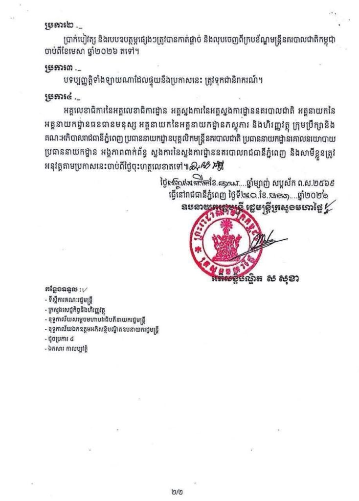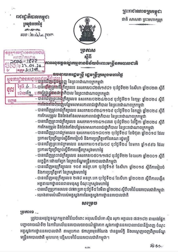 ភ្នំពេញ ៖ មន្ត្រីនគរបាលម្នាក់ឈ្មោះ ស៊ិន សុភា អត្តលេខ ៧៧១៨២ ជានាយរងផ្នែកបញ្ជាចរាចរណ៍ទី២ នៃការិយាល័យនគរបាលចរាចរណ៍ផ្លូវគោក ស្នងការដ្ឋាននគរបាលរាជធានីភ្នំពេញ ល្មើសបទវិន័យកងកម្លាំងនគរបាលជាតិកម្ពុជា ត្រូវបានក្រសួងមហាផ្ទៃ សម្រេចអនុវត្តវិន័យបណ្តេញចេញពីក្របខណ្ឌនគរបាលជាតិ កាលពីថ្ងៃទី២០ ខែមករា ឆ្នាំ២០២៦ ។