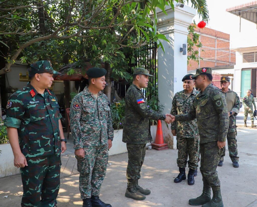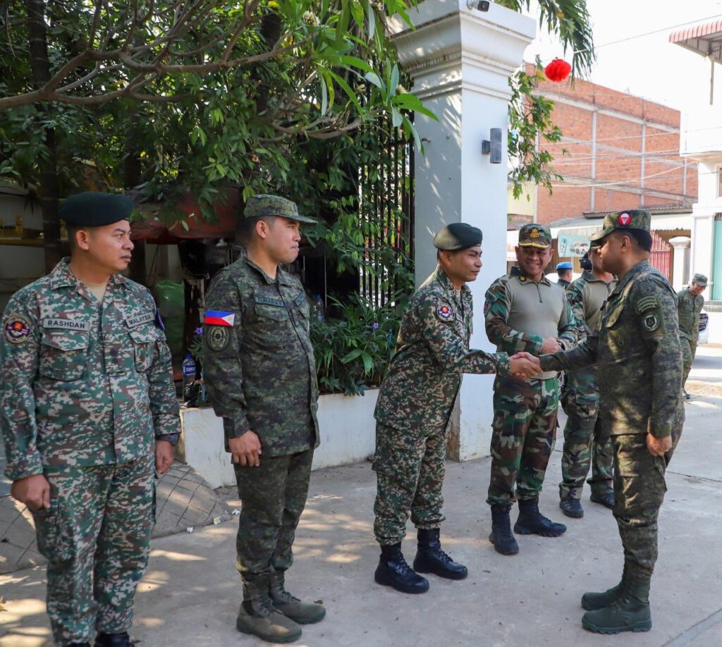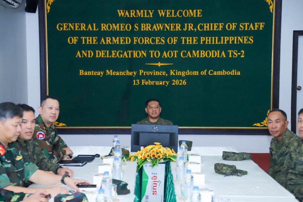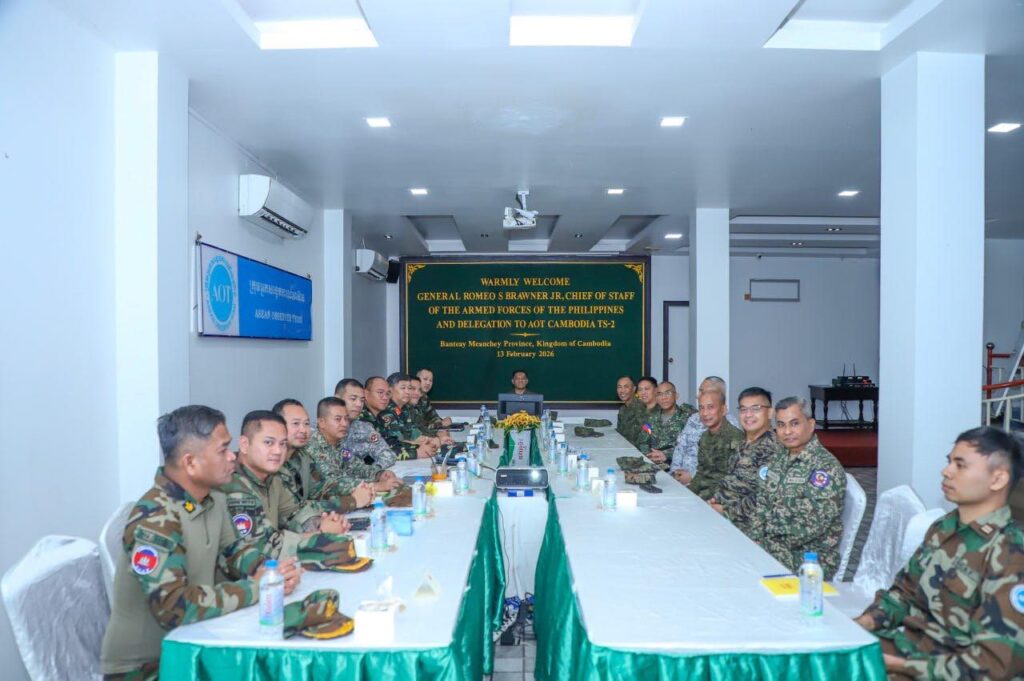 ខេត្តបន្ទាយមានជ័យ ៖ លោកជំទាវ ឧត្តមសេនីយ៍ឯក ម៉ាលី សុជាតា អ្នកនាំពាក្យក្រសួងការពារជាតិ នៃព្រះរាជាណាចក្រកម្ពុជា សូមជម្រាបជូនសាធារណជន អ្នកសារព័ត៌មានជាតិ និងអន្តរជាតិមេត្តាជ្រាបថា៖ នៅថ្ងៃសុក្រ ទី១៣ ខែកុម្ភៈ ឆ្នាំ២០២៦នេះ ក្រុមសម្របសម្រួល (CLG) នៃព្រះរាជាណាចក្រកម្ពុជា បានសម្របសម្រួលជូនដល់ក្រុមអ្នកសង្កេតការណ៍អាស៊ាន (AOT) ទទួលស្វាគមន៍ ឯកឧត្តម នាយឧត្តមសេនីយ៍ ROMEO S BRAWNER JR អគ្គមេបញ្ជាការ នៃកងទ័ពហ្វីលីពីន ដែលអញ្ជើញមកទស្សនកិច្ចទីតាំងមួយចំនួននៅក្នុងខេត្តបន្ទាយមានជ័យ។ ដោយនៅវេលាម៉ោង ១០:០០នាទីព្រឹក គណៈប្រតិភូបានអញ្ជើញទៅទស្សនកិច្ចស្នាក់ការ២ ស្ថិតនៅក្រុងសិរីសោភ័ណ ដោយក្នុងឱកាសនោះ វរសេនីយ៍ឯក MOHD FARID BIN MOHD YUSOP ប្រធានក្រុមអ្នកសង្កេតការណ៍អាស៊ាន (AOT) ប្រចាំកម្ពុជាក៏បានធ្វើបទបង្ហាញជូនឯកឧត្តម អគ្គមេបញ្ជាការ និងគណៈប្រតិភូ ស្តីពីវឌ្ឍនភាពការងាររបស់ខ្លួនផងដែរ។