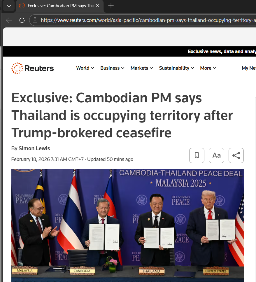 វ៉ាស៊ីនតោន ថ្ងៃទី១៧ ខែកុម្ភៈ (រ៉យទ័រ) – នាយករដ្ឋមន្ត្រីកម្ពុជា សម្តេចបវរធិបតី ហ៊ុន ម៉ាណែត បានប្រាប់រ៉យទ័រនៅថ្ងៃអង្គារថា កងកម្លាំងថៃកំពុងកាន់កាប់ទឹកដីកម្ពុជា បន្ទាប់ពីការប្រយុទ្ធគ្នាកាលពីឆ្នាំមុន ទោះបីជាមានកិច្ចព្រមព្រៀងសន្តិភាពដែលសម្របសម្រួលដោយប្រធានាធិបតីអាមេរិក លោក ដូណាល់ ត្រាំ និងបានអំពាវនាវឱ្យប្រទេសថៃអនុញ្ញាតឱ្យគណៈកម្មការព្រំដែនរួមមួយចាប់ផ្តើមធ្វើការលើព្រំដែនដែលមានជម្លោះរបស់ពួកគេក៏ដោយ។