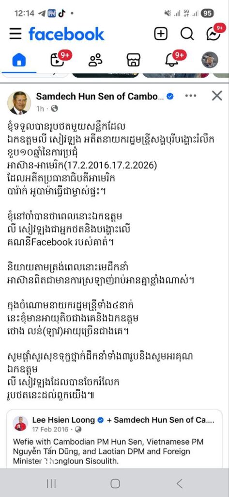 ឯកឧត្តមលី សៀវឡុង អតីតនាយករដ្ឋមន្ត្រីសង្ហបុរីបង្ហោះរំលឹកខួប១០ឆ្នាំនៃការប្រជុំអាស៊ាន-អាមេរិក(17.2.2016.17.2.2026)