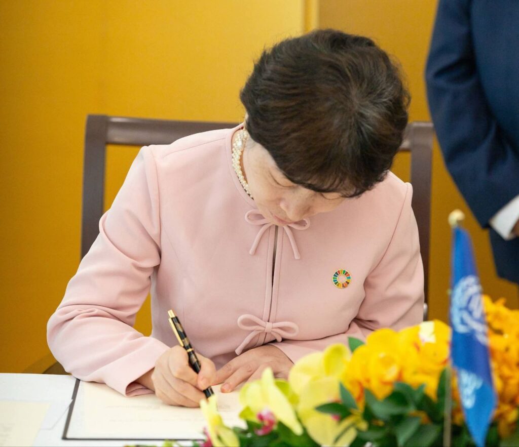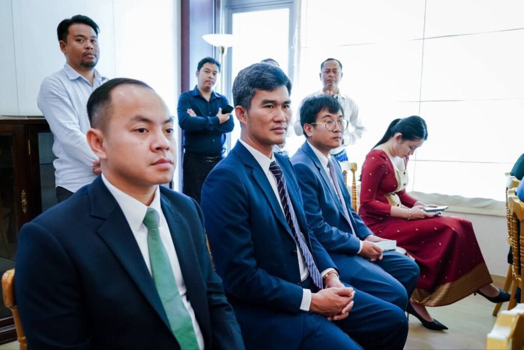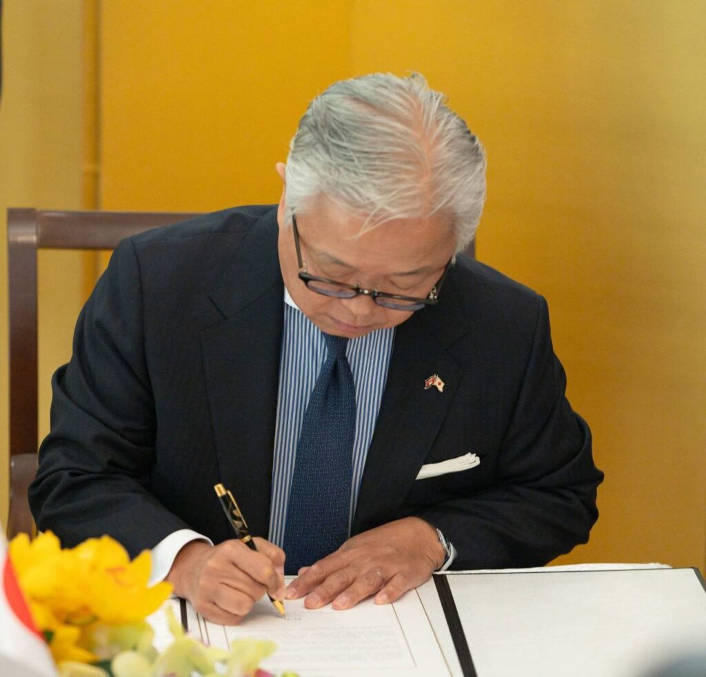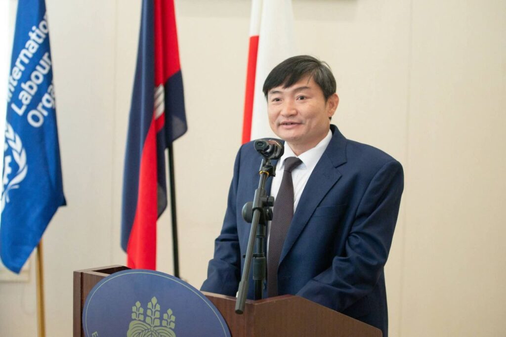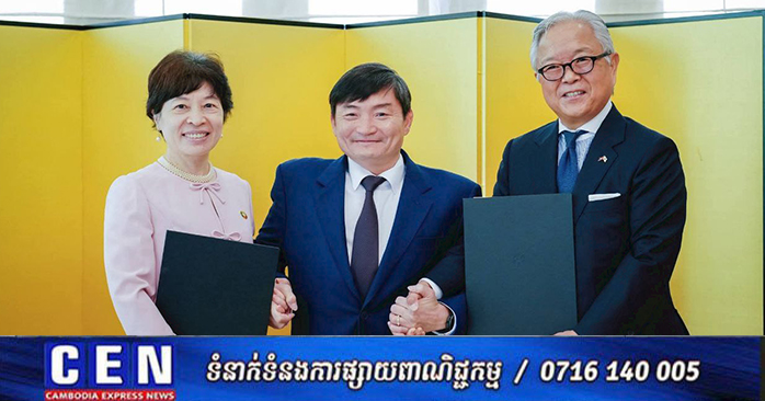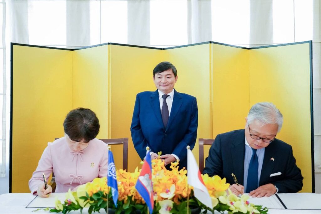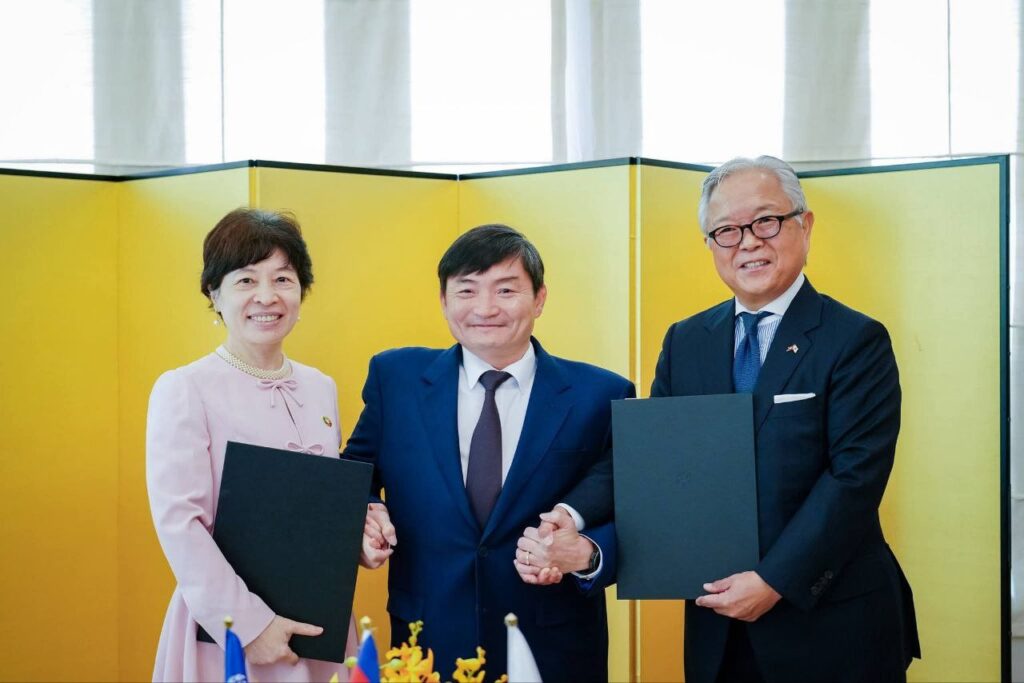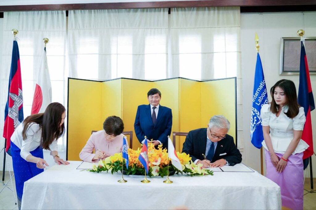 ភ្នំពេញ៖ ឯកឧត្តម ហេង សួរ រដ្ឋមន្ត្រីក្រសួងការងារ និងបណ្តុះបណ្តាលវិជ្ជាជីវៈ បានអញ្ជើញធ្វើជាសក្ខីភាពក្នុងពិធីចុះហត្ថលេខាលើគម្រោងស្តីពី «ការលើកកម្ពស់មុខរបរនិងការងារដល់ពលករចំណាកស្រុកត្រឡប់មកវិញ ដែលរងផលប៉ះពាល់ពីជម្លោះព្រំដែន» ដោយឯកឧត្ដម អ៊ូអិណុ អាត់ស៊ូស៊ី (UENO Atsushi) ឯកអគ្គរាជទូតវិសាមញ្ញ និងពេញសមត្ថភាពរបស់ប្រទេសជប៉ុនប្រចាំកម្ពុជា និងលោកស្រី ស៊ាវយៀន ឈាន (Xiaoyan Qian) នាយិកាការិយាល័យអង្គការ ILO ប្រចាំកម្ពុជា ឡាវ និងថៃ នាព្រឹកថ្ងៃទី១៨ ខែកុម្ភៈ ឆ្នាំ២០២៦ នៅស្ថានទូតជប៉ុន។