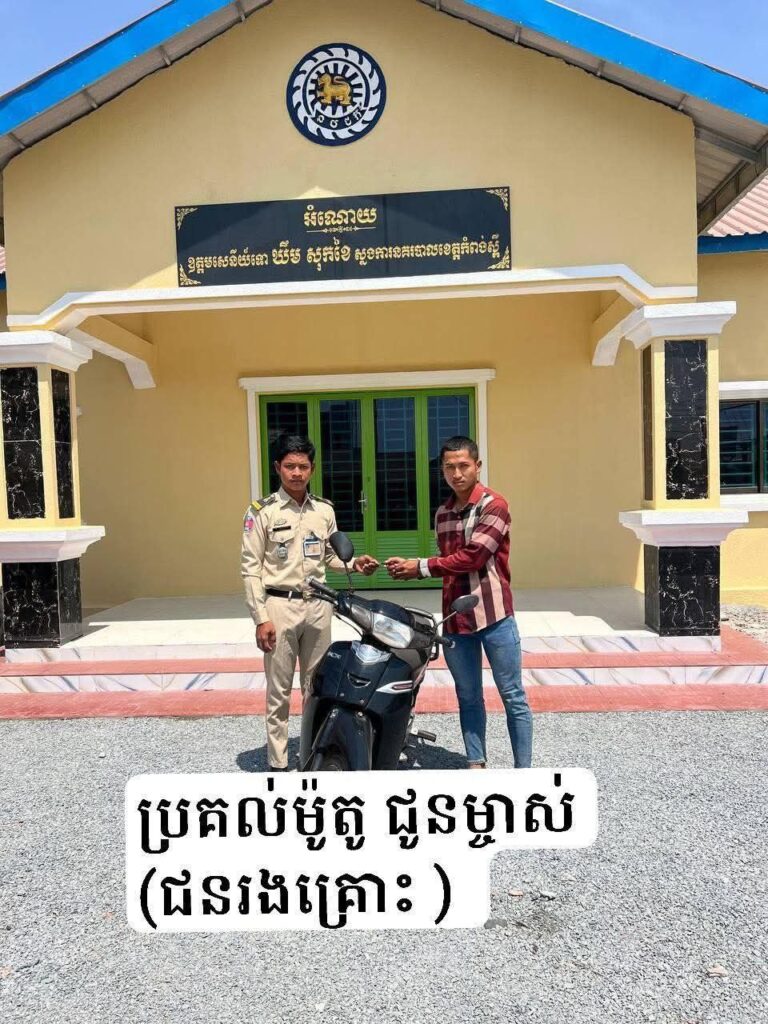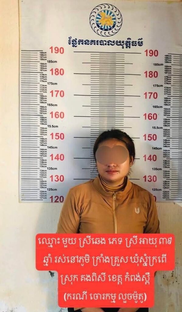 ដោយបានការបញ្ជាដឹកនាំដ៏ខ្ពង់ខ្ពស់ពីលោកឧត្ដមសេនីយ៍ទោ ឃឹម សុកខៃ ស្នងការនគរបាលខេត្ដកំពង់ស្ពឺ និងការណែនាំពីលោកស្នងការរងផែនការងារនគរបាលព្រហ្មទណ្ឌខេត្ដ កំលាំងអធិការដ្ឋាននគរបាលស្រុកគងពិសីដឹកនាំផ្ទាល់ដោយលោកវរសេនីយ៍ឯក យ៉ាង សុខលី អធិការនគរបាលស្រុកគងពិសី បានសហការធ្វេីការស្រាវជ្រាវរហូតឈានទៅកំណត់បានមុខសញ្ញាជនសង្ស័យជាចោរលួចម៉ូតូខាងលេី នៅថ្ងៃទី១៨ ខែកុម្ភៈ ឆ្នាំ២០២៦ សមត្ថកិច្ចបានឃាត់ឈ្មោះ មួយ ស្រីឆេង ភេទស្រី អាយុ ៣៨ឆ្នាំ រស់នៅភូមិក្រាំងគ្រួស ឃុំស្នំក្រពើ ស្រុកគងពិសី ខេត្តកំពង់ស្ពឺ យកមកសួរនាំ និងបានដកហូតម៉ូតូ១គ្រឿងរបស់ជនរងគ្រោះត្រឡប់មកវិញ។