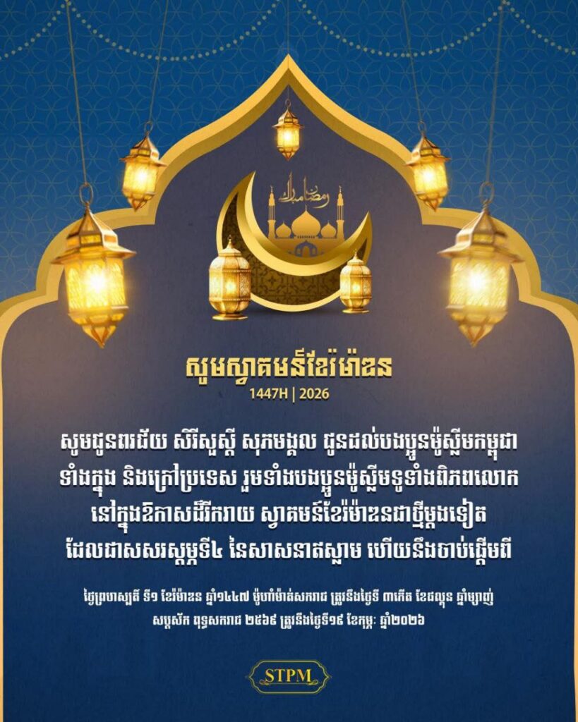 ភ្នំពេញ ៖ សម្តេចមហាបវរធិបតី ហ៊ុន ម៉ាណែត នាយករដ្ឋមន្រ្តីនៃព្រះរាជាណាចក្រកម្ពុជា បានមានប្រសាសន៍ថា តាងនាមរាជរដ្ឋាភិបាល នៃព្រះរាជាណាចក្រកម្ពុជា នីតិកាលទី៧ នៃរដ្ឋសភា ដែលដឹកនាំដោយគណបក្សប្រជាជនកម្ពុជា ខ្ញុំនិងភរិយា សូមអបអរសាទរ និងសូមជូននូវពរជ័យ សិរីសួស្ដី សុភមង្គល ជូនដល់បងប្អូនម៉ូស្លីមកម្ពុជា ទាំងក្នុង និង ក្រៅប្រទេស រួមទាំងបងប្អូនម៉ូស្លីមនៅទូទាំងពិភពលោក ដែលនឹងចូលបួសខែរ៉ម៉ាឌន ខែពិសិដ្ឋក្នុងសាសនាឥស្លាម ហើយជាសសរស្តម្ភទី៤ ក្នុងសាសនាឥស្លាម ដោយនៅប្រទេសកម្ពុជាយើងនឹងចាប់ផ្ដើមនៅថ្ងៃព្រហស្បតិ៍ ទី១ ខែរ៉ម៉ាឌន ឆ្នាំ ១៤៤៧ មូហាំម៉ាត់សករាជ ត្រូវនឹងថ្ងៃ៣កើត ខែផល្គុន ឆ្នាំម្សាញ់ សប្តស័ក ព.ស.២៥៦៩ ត្រូវនឹងថ្ងៃទី១៩ ខែកុម្ភៈ ឆ្នាំ២០២៦។