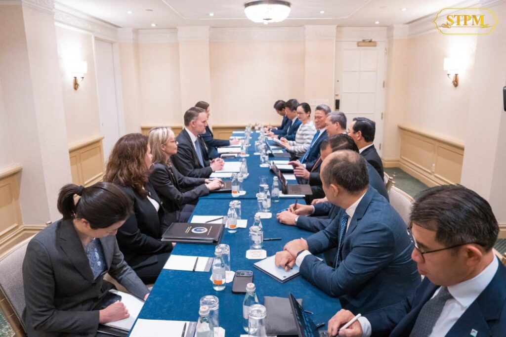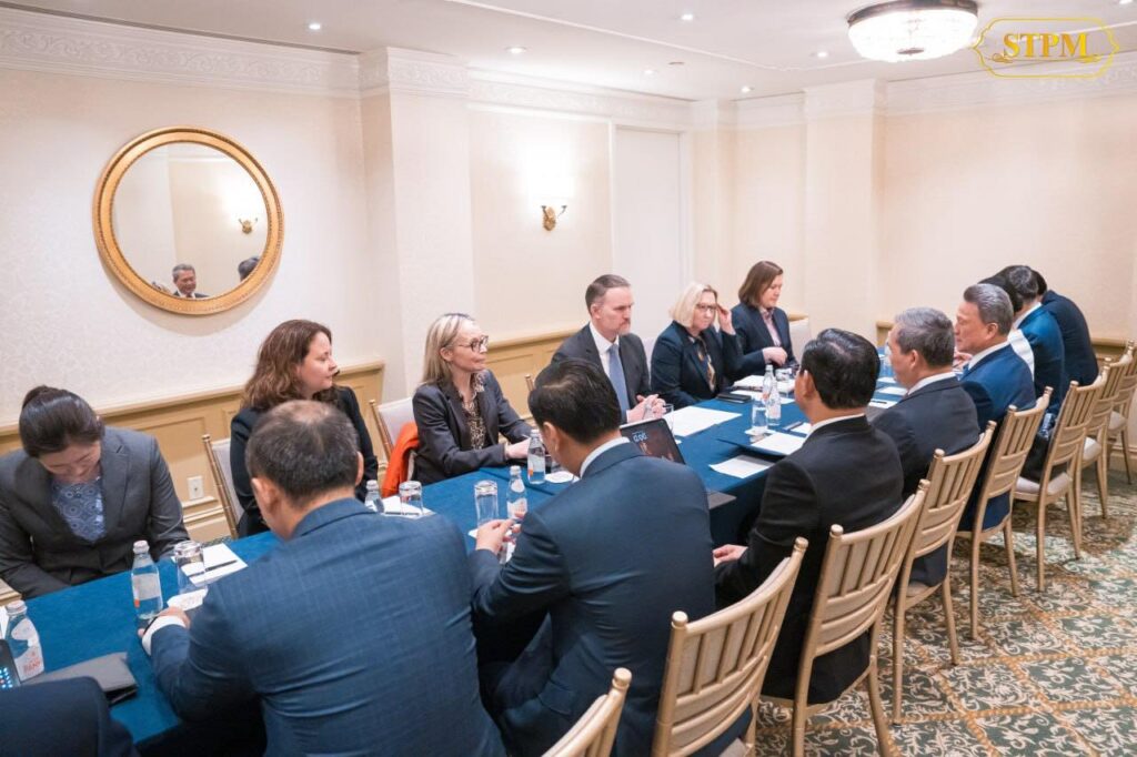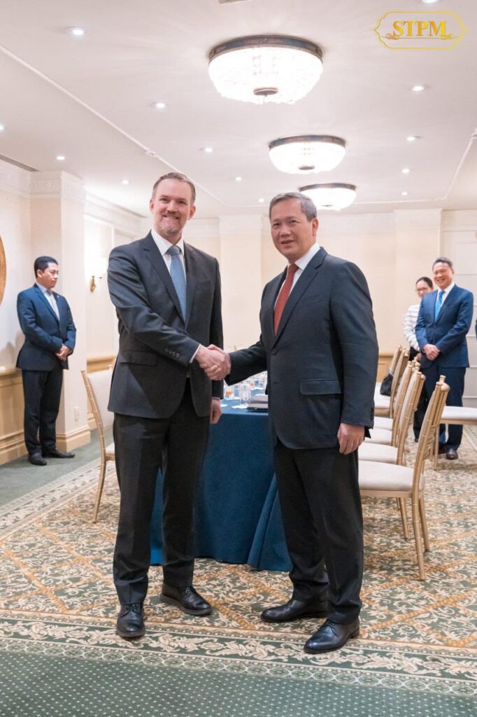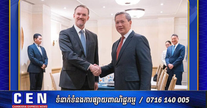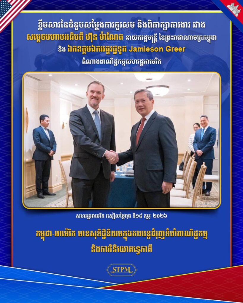 អាមេរិក ៖ នារសៀលថ្ងៃទី១៨ ខែកុម្ភៈ ឆ្នាំ២០២៦, សម្ដេចមហាបវរធិបតី ហ៊ុន ម៉ាណែត នាយករដ្ឋមន្ត្រី នៃព្រះរាជាណាចក្រកម្ពុជា បានជួបពិភាក្សាការងារជាមួយ ឯកឧត្ដមឯកអគ្គរដ្ឋទូត Jamieson Greer តំណាងពាណិជ្ជកម្មសហរដ្ឋអាម៉េរិក ក្នុងឱកាសនៃការដឹកនាំគណៈប្រតិភូរាជរដ្ឋាភិបាលកម្ពុជាចូលរួមកិច្ចប្រជុំលើកដំបូងនៃក្រុមប្រឹក្សាសន្តិភាព (Board of Peace) នៅរដ្ឋធានីវ៉ាស៊ីនតោន សហរដ្ឋអាម៉េរិក។
