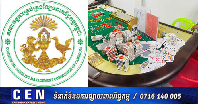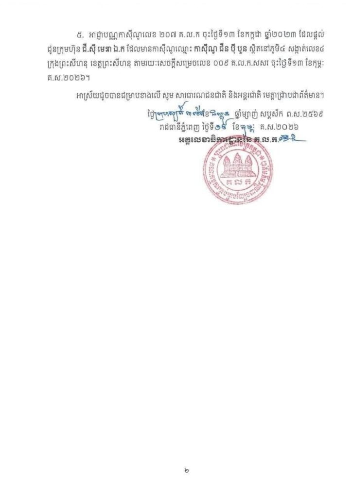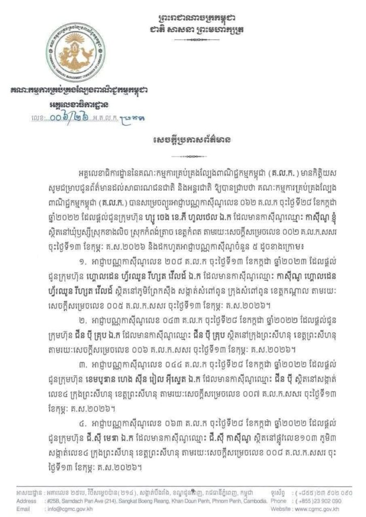 រាជធានីភ្នំពេញ ៖ នៅថ្ងៃទី១៩ ខែកុម្ភៈ គ.ស.២០២៦ អគ្គលេខាធិការដ្ឋាននៃគណៈកម្មការគ្រប់គ្រងល្បែងពាណិជ្ជកម្មកម្ពុជា (គ.ល.ក.) សូមជម្រាបជូនព័ត៌មានដល់សាធារណជនជាតិ និងអន្តរជាតិ ឱ្យបានជ្រាបថា គណៈកម្មការគ្រប់គ្រងល្បែង ពាណិជ្ជកម្មកម្ពុជា (គ.ល.ក.) បានសម្រេចព្យួរអាជ្ញាបណ្ណកាស៊ីណូលេខ ០៦២ គ.ល.ក ចុះថ្ងៃទី២៨ ខែកក្កដា ឆ្នាំ២០២២ ដែលផ្តល់ជូនក្រុមហ៊ុន ហ្សូ ចេង ខេ.ភី ហូលថេល ឯ.ក ដែលមានកាស៊ីណូឈ្មោះ កាស៊ីណូ ខ្ញុំ ស្ថិតនៅឃុំឫស្សីស្រុកខាងលិច ស្រុកកំពង់ត្រាច ខេត្តកំពត តាមរយៈសេចក្ដីសម្រេចលេខ ០០២ គ.ល.ក.សសរ ចុះថ្ងៃទី១៣ ខែកុម្ភៈ គ.ស.២០២៦ និងដកហូតអាជ្ញាបណ្ណកាស៊ីណូចំនួន ៥ ដូចខាងក្រោម៖