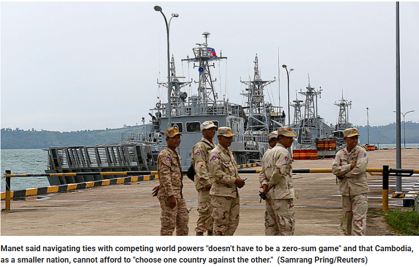 សម្តេចហ៊ុន ម៉ាណែត បាននិយាយថា ការរុករកទំនាក់ទំនងជាមួយមហាអំណាចពិភពលោកដែលប្រកួតប្រជែង “មិនចាំបាច់ជាល្បែងដែលមានផលបូកសូន្យទេ” ហើយថា កម្ពុជា ក្នុងនាមជាប្រទេសតូចមួយ មិនអាចមានលទ្ធភាព “ជ្រើសរើសប្រទេសមួយទល់នឹងប្រទេសមួយទៀត” បានទេ។
