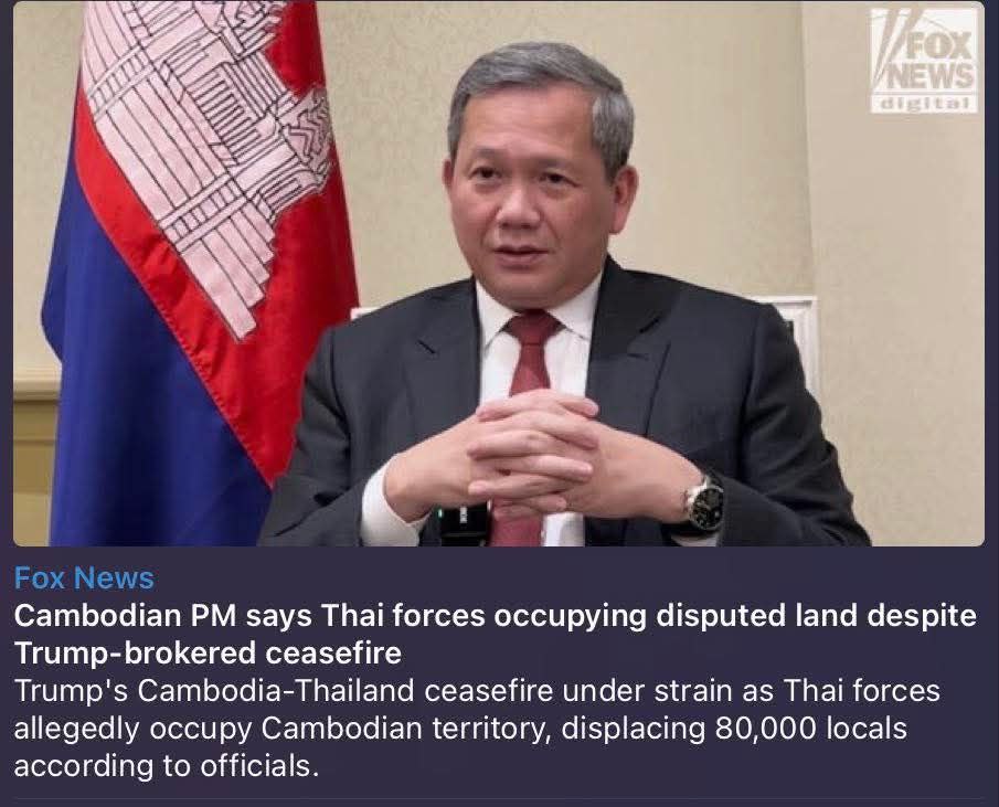 ឥឡូវនេះ កិច្ចព្រមព្រៀងនោះហាក់ដូចជាស្ថិតនៅក្រោមភាពតានតឹង។ នាយករដ្ឋមន្ត្រីកម្ពុជា សម្តេចធិបតី ហ៊ុន ម៉ាណែត បានប្រាប់ Fox News Digital ថា កងកម្លាំងថៃបានរុញច្រានចូលទៅក្នុងទឹកដីកម្ពុជាដែលកាន់កាប់ជាយូរមកហើយហួសពីខ្សែជម្លោះ។ ទាហានថៃបានបិទភូមិនានាដោយលួសបន្លា និងកុងតឺន័រដឹកជញ្ជូន ដែលធ្វើឱ្យប្រជាជនកម្ពុជាចំនួន 80,000 នាក់មិនអាចវិលត្រឡប់ទៅផ្ទះវិញបានទេ នេះបើយោងតាមមន្ត្រីកម្ពុជា។