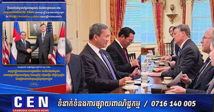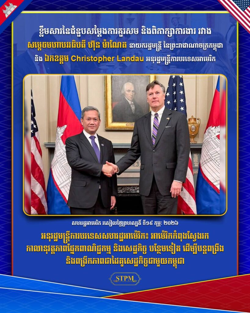អាម៉េរិក ៖ នារសៀលថ្ងៃទី១៩ ខែកុម្ភៈ ឆ្នាំ២០២៦, សម្ដេចមហាបវរធិបតី ហ៊ុន ម៉ាណែត នាយករដ្ឋមន្ត្រីនៃព្រះរាជាណាចក្រកម្ពុជា បានជួបពិភាក្សាការងារជាមួយ ឯកឧត្តម គ្រីស្តូហ្វឺ ឡានដាវ (Christopher Landau) អនុរដ្ឋមន្ត្រីការបរទេសសហរដ្ឋអាម៉េរិក ក្នុងឱកាសនៃការអញ្ជើញដឹកនាំគណៈប្រតិភូជាន់ខ្ពស់រាជរដ្ឋាភិបាលកម្ពុជា ចូលរួមកិច្ចប្រជុំលើកដំបូងនៃក្រុមប្រឹក្សាសន្តិភាព (Board of Peace) នៅរដ្ឋធានីវ៉ាស៊ីនតោន សហរដ្ឋអាម៉េរិក។