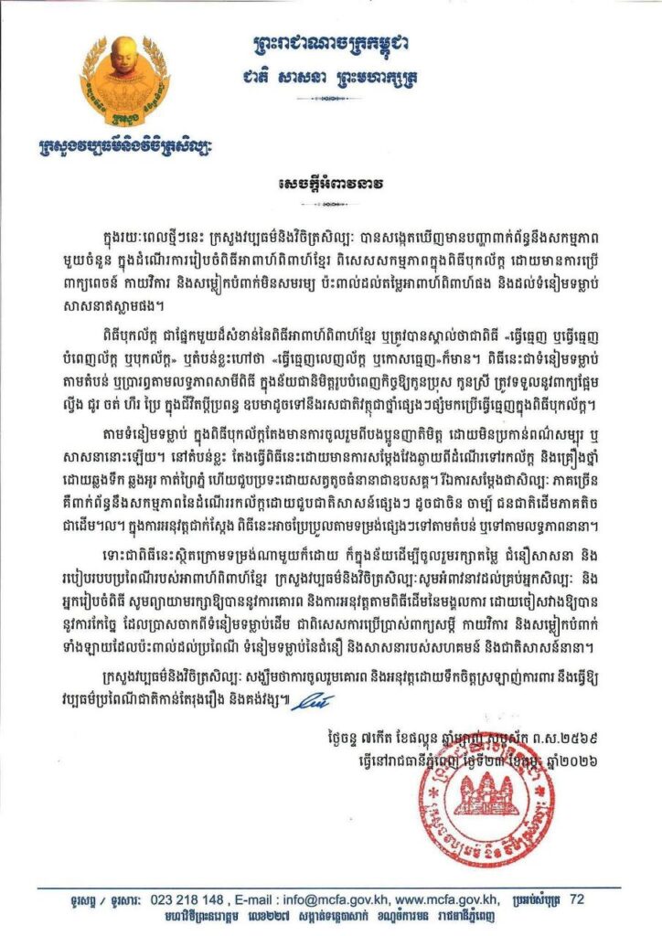 រាជធានីភ្នំពេញ ៖ ក្នុងរយៈពេលថ្មីៗនេះ ក្រសួងវប្បធម៌និងវិចិត្រសិល្បៈ បានសង្កេតឃើញមានបញ្ហាពាក់ព័ន្ធនឹងសកម្មភាព មួយចំនួន ក្នុងដំណើរការរៀបចំពិធីអាពាហ៍ពិពាហ៍ខ្មែរ ពិសេសសកម្មភាពក្នុងពិធីបុកល័ក្ត ដោយមានការបើ ពាក្យពេចន៍ កាយវិការ និងសម្លៀកបំពាក់មិនសមរម្យ ប៉ះពាល់ដល់តម្លៃអាពាហ៍ពិពាហ៍ផង និងដល់ទំនៀមទម្លាប់សាសនាឥស្លាមផង។ នេះបើតាមសេចក្តីអំពាវនាវរបស់ក្រសួងវប្បធម៌និងវិចិត្រសិល្បៈនៅថ្ងៃទី២៣ ខែកុម្ភៈ ឆ្នាំ២០២៦។