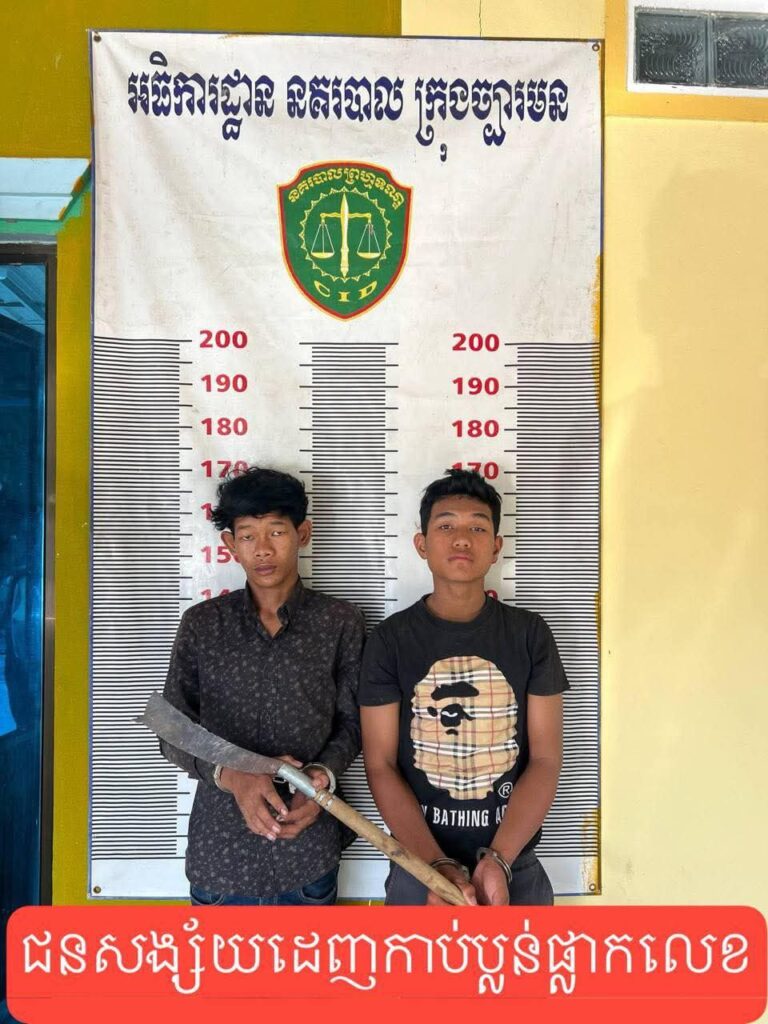 ជនសង្ស័យ មានឈ្មោះ (១) ផាន់ ច័ន្ទសុភ័ណ្ឌ ភេទប្រុស អាយុ ១៦ឆ្នាំ រស់នៅភូមិពាណិជ្ជកម្ម សង្កាត់រការធំ ក្រុងច្បារមន ខេត្តកំពង់ស្ពឺ (២)-សំ សុវណ្ណារ៉ា ភេទប្រុស អាយុ១៩ ឆ្នាំ រស់នៅភូមិតាំក្រសាំង ឃុំព្នាយ ស្រុកសំរោងទង ខេត្តកំពង់ស្ពឺ ។