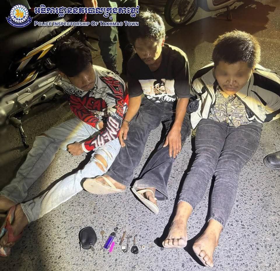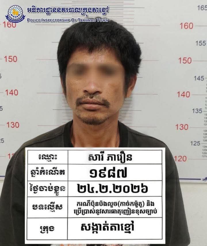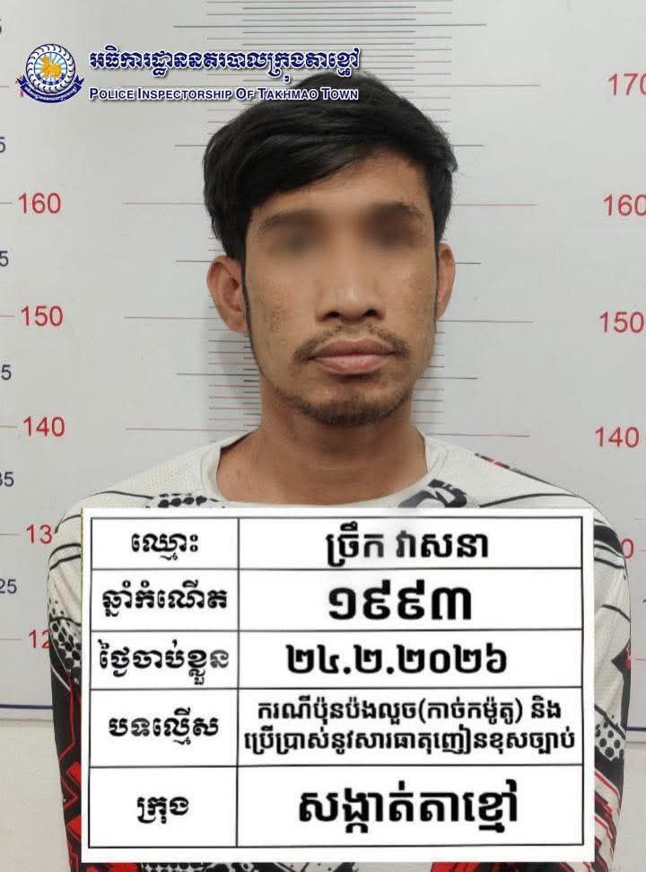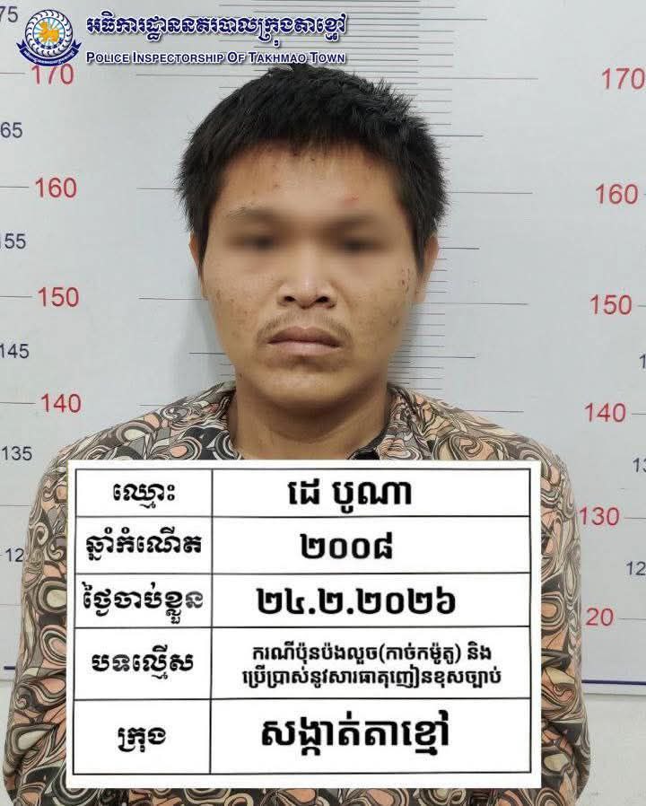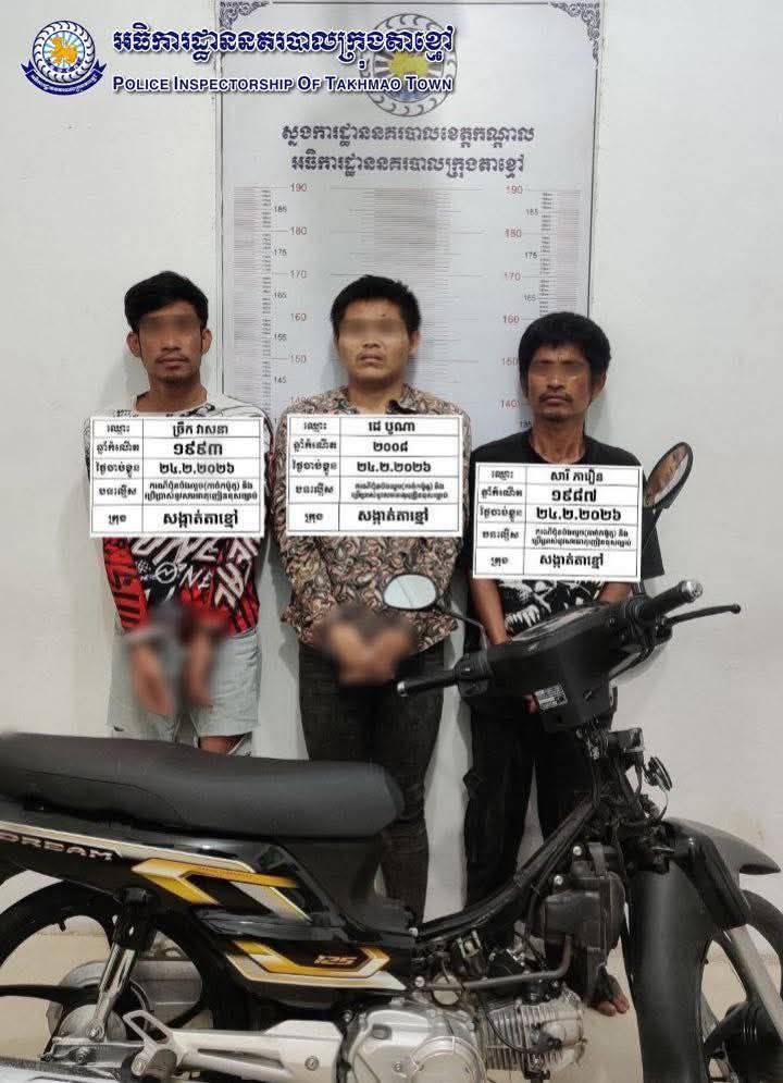 កណ្តាល ៖ ដោយអនុវត្តតាមបទបញ្ជារបស់ លោកឧត្តមសេនីយ៍ទោ ឈឿន សុចិត្ត ស្នងការ នៃស្នងការដ្ឋាននគរបាលខេត្តកណ្តាល នៅថ្ងៃទី២៤ខែកុម្ភៈឆ្នាំ២០២៦ កម្លាំងនគរបាលព្រហ្មទណ្ឌ ក្រុមល្បាតអន្តរាគមន៍ ដឹកនាំបញ្ជាដោយលោកវរសេនីយ៍ឯក យី វណ្ណដា អធិការនគរបាលក្រុងតាខ្មៅ ល្បាតប្រដេញបង្ក្រាបឃាត់នៅចំណុច រង្វង់មូលព្រែកសំរោងភូមិព្រែកសំរោង សង្កាត់តាខ្មៅក្រុងតាខ្មៅ ខេត្តកណ្តាល ឃាត់ខ្លួនជនសង្ស័យចំនួន៣នាក់ ១-ឈ្មោះដេ បូណា ភេទប្រុស អាយុ ១៨ ឆ្នាំ ជនជាតិខ្មែរ មានទីលំនៅភូមិទួលរកា សង្កាត់ចាក់អង្រែក្រោម ខណ្ឌមានជ័យ រាជធានីភ្នំពេញ ២-ឈ្មោះសារី ភារឿន ភេទប្រុស អាយុ៣៨ឆ្នាំ ជនជាតិខ្មែរ រស់នៅភូមិគគីធំ ឃុំគគីធំ ស្រុកកៀនស្វាយ ខេត្តកណ្តាល ៣-ឈ្មោះច្រឹក វាសនា ភេទប្រុស អាយុ៣២ឆ្នាំ ជនជាតិខ្មែរ រស់នៅភូមិកំពង់ពោធិ៍ ឃុំកំពង់ភ្នំ ស្រុកកៀនស្វាយ ខេត្តកណ្តាល ។ ជនសង្ស័យទាំង០៣នាក់ គ្មានមុខរបរពិតប្រាកដ វិជ្ជមាននូវសារធាតុញៀន(+) ។