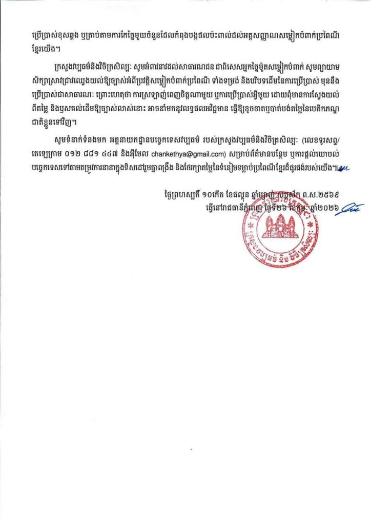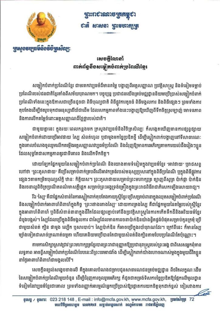 ក្រសួងវប្បធម៌និងវិចិត្រសិល្បៈ សូមអំពាវនាវដល់សាធារណជន ជាពិសេសអ្នកច្នៃម៉ូតសម្លៀកបំពាក់ សូមព្យាយាម សិក្សាស្រាវជ្រាវឈ្វេងយល់ឱ្យច្បាស់អំពីប្រវត្តិសម្លៀកបំពាក់ប្រពៃណី ទាំងទម្រង់ និងបរិបទដើមនៃការប្រើប្រាស់ មុននឹង ប្រើប្រាស់ជាសាធារណៈ ព្រោះហេតុថា ការស្រឡាញ់ពេញចិត្តណាមួយ ឬការប្រើប្រាស់អ្វីមួយ ដោយពុំមានការស្វែងយល់ ពីតម្លៃ និងឫសគល់ដើមឱ្យច្បាស់លាស់នោះ អាចនាំមកនូវលទ្ធផលអវិជ្ជមាន ធ្វើឱ្យខូចខាតឬបាត់បង់តម្លៃនៃបេតិកភណ្ឌ ជាតិខ្លួនទៅវិញ៕ រក្សាសិទ្ធដោយ៖សុទ្ធលី
