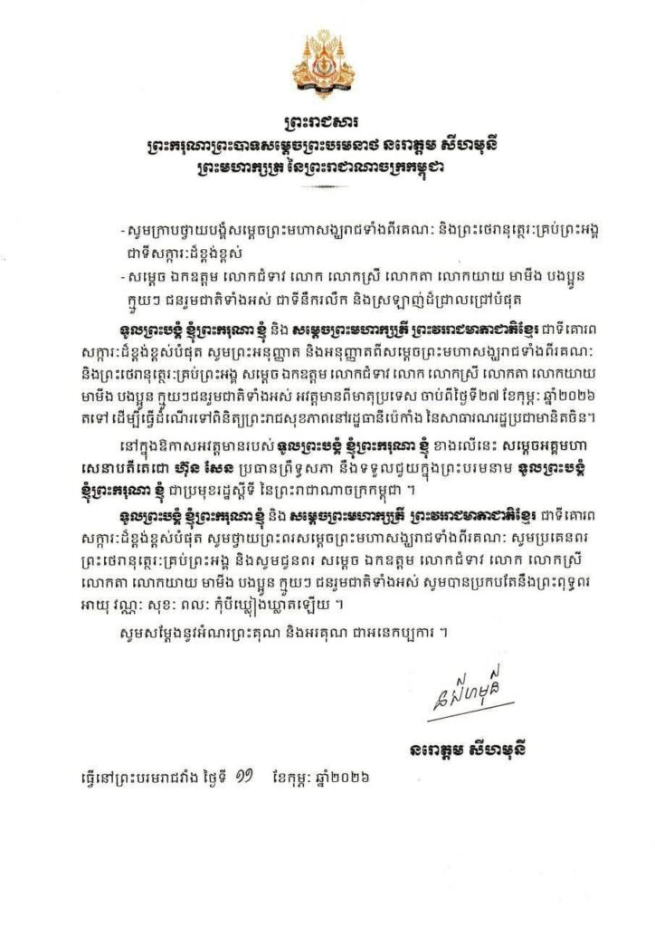 យោងតាមព្រះរាជសាររបស់ព្រះករុណាព្រះបាទសម្តេចព្រះបរមនាថ នរោត្តម សីហមុនី ព្រះមហាក្សត្រ នៃព្រះរាជាណាចក្រកម្ពុជា បានខ្លឹមសារយ៉ាងដូច្នេះថា ទូលព្រះបង្គំ ខ្ញុំព្រះករុណាខ្ញុំ និង សម្ដេចព្រះមហាក្សត្រី ព្រះវររាជមាតាជាតិខ្មែរ ជាទីគោរព សក្ការៈដ៏ខ្ពង់ខ្ពស់បំផុត សូមព្រះអនុញ្ញាត និងអនុញ្ញាតពីសម្តេចព្រះមហាសង្ឃរាជទាំងពីរគណៈ និងព្រះថេរានុត្ថេរៈគ្រប់ព្រះអង្គ សម្តេច ឯកឧត្តម លោកជំទាវ លោក លោកស្រី លោកតា លោកយាយ មាមីង បងប្អូន ក្មួយៗជនរួមជាតិទាំងអស់ អវត្តមានពីមាតុប្រទេស ចាប់ពីថ្ងៃទី២៧ ខែកុម្ភៈ ឆ្នាំ២០២៦ តទៅ ដើម្បីធ្វើដំណើរទៅពិនិត្យព្រះរាជសុខភាពនៅរដ្ឋធានីប៉េកាំង នៃសាធារណរដ្ឋប្រជាមានិតចិន។ នៅក្នុងឱកាសអវត្តមានរបស់ ទូលព្រះបង្គំ ខ្ញុំព្រះករុណា ខ្ញុំ ខាងលើនេះ សម្តេចអគ្គមហា សេនាបតីតេជោ ហ៊ុន សែន ប្រធានព្រឹទ្ធសភា នឹងទទួលជួយក្នុងព្រះបរមនាម ទូលព្រះបង្គំ ខ្ញុំព្រះករុណា ខ្ញុំ ជាប្រមុខរដ្ឋស្តីទី នៃព្រះរាជាណាចក្រកម្ពុជា ៕ រក្សាសិទ្ធដោយ៖សុទ្ធលី