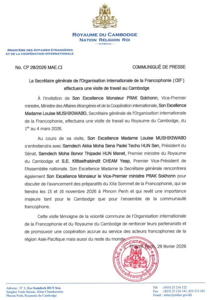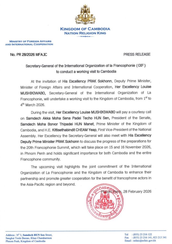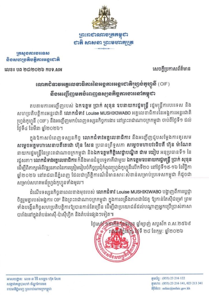 ភ្នំពេញ ៖ តបតាមការអញ្ជើញរបស់ ឯកឧត្តម ប្រាក់ សុខុន ឧបនាយករដ្ឋមន្ត្រី រដ្ឋមន្ត្រីការបរទេស និង សហប្រតិបត្តិការអន្តរជាតិ លោកជំទាវ Louise MUSHIKIWABO អគ្គលេខាធិការនៃអង្គការអន្តរជាតិ ហ្វ្រង់កូហ្វូនី (OIF) នឹងអញ្ជើញមកបំពេញទស្សនកិច្ចការងារ នៅព្រះរាជាណាចក្រកម្ពុជា ចាប់ពីថ្ងៃទី១ ដល់ ថ្ងៃទី៤ ខែមីនា ឆ្នាំ២០២៦។