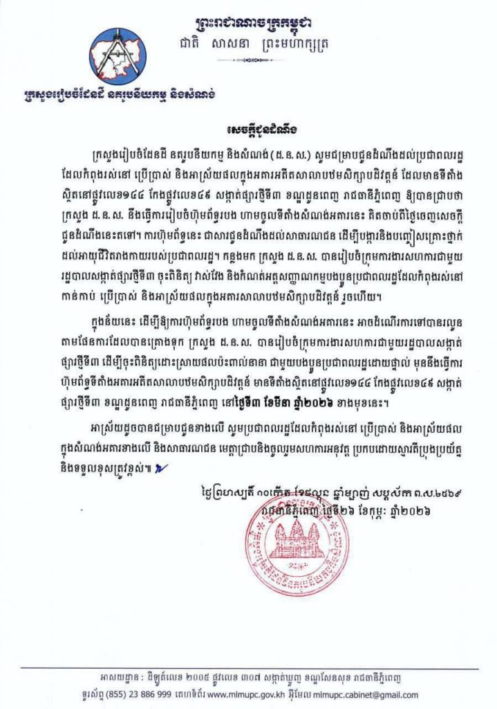 ក្នុងន័យនេះ ដើម្បីឱ្យការហ៊ុមព័ទ្ធរបង ហាមចូលទីតាំងសំណង់អគារនេះ អាចដំណើរការទៅបានរលូន តាមផែនការដែលបានគ្រោងទុក ក្រសួង ដ. ន. ស. បានរៀបចំក្រុមការងារសហការជាមួយរដ្ឋបាលសង្កាត់ ផ្សារថ្មីទី៣ ដើម្បីចុះពិនិត្យដោះស្រាយផលប៉ះពាល់នានា ជាមួយបងប្អូនប្រជាពលរដ្ឋដោយផ្ទាល់ មុននឹងធ្វើការ ហ៊ុមព័ទ្ធទីតាំងអគារអតីតសាលាបឋមសិក្សាបដិវត្តន៍ មានទីតាំងស្ថិតនៅផ្លូវលេខ១៤៤ កែងផ្លូវលេខ៤៩ សង្កាត់ ផ្សារថ្មីទី៣ ខណ្ឌដូនពេញ រាជធានីភ្នំពេញ នៅថ្ងៃទី៣ ខែមីនា ឆ្នាំ២០២៦ ខាងមុខនេះ៕រក្សាសិទ្ធដោយ៖សុទ្ធលី
