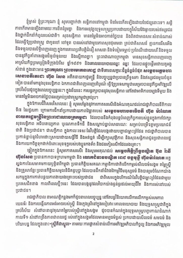 ក្នុងឱកាសដ៏វិសេសវិសាលនេះ ខ្ញុំ សូមសម្តែងនូវការកោតសរសើរនិងអំណរគុណដល់រាជរដ្ឋាភិបាលនីតិកាល ទី៧ នៃរដ្ឋសភា ក្រោមការដឹកនាំប្រកបដោយភាពវៃឆ្លាតរបស់ សម្ដេចមហាបវរធិបតី ហ៊ុន ម៉ាណែត នាយករដ្ឋមន្ដ្រីនៃព្រះរាជាណាចក្រកម្ពុជា ដែលបាននឹងកំពុងបន្តបំពេញកិច្ចការរបស់ខ្លួនក្នុងការថែរក្សា សុខសន្តិភាព អធិបតេយ្យភាព បូរណភាពទឹកដី និងសណ្ដាប់ធ្នាប់សាធារណៈ សម្រាប់បម្រើឧត្តមប្រយោជន៍ ជាតិ និងប្រជាជន។ ជាសក្ខីភាព ក្នុងកាលៈទេសៈនៃវិបត្តិដែលបង្កដោយបញ្ហាជម្លោះព្រំដែន រាជរដ្ឋាភិបាលបាន ប្រកាន់ខ្ជាប់នូវជំហរដោះស្រាយដោយសន្តិវិធី និងអត់ធ្មត់ ដើម្បីរក្សាសុវត្ថិភាព និងសុខសន្តិភាពជូនប្រជាពលរដ្ឋ និងការយកចិត្តទុកដាក់ចំពោះសុខទុក្ខរបស់បងប្អូនកងទ័ព និងជនភៀសសឹកដែលរងគ្រោះ។