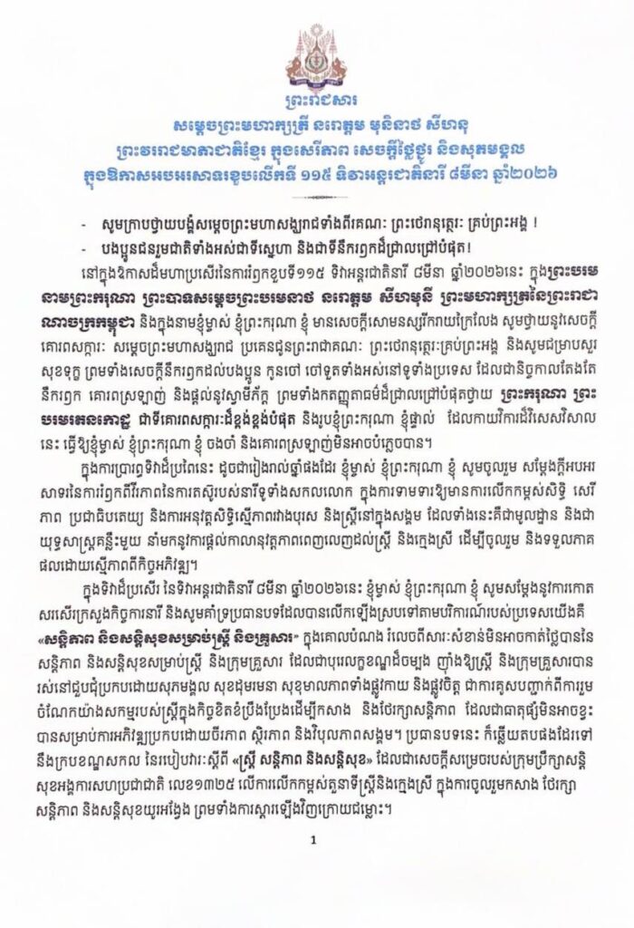 ភ្នំពេញ៖ ព្រះរាជសារសម្តេចព្រះមហាក្សត្រី នរោត្តម មុនិនាថ សីហនុព្រះវររាជមាតាជាតិខ្មែរ ក្នុងសេរីភាព សេចក្ដីថ្លៃថ្នូរ និងសុភមង្គល ក្នុងឱកាសអបអរសាទរខួបលើកទី ១១៥ ទិវាអន្តរជាតិនារី ៨មីនា ឆ្នាំ២០២៦។