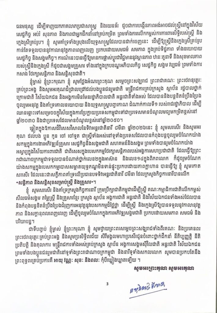 ក្នុងទិវាដ៏ប្រសើរ នៃទិវាអន្តរជាតិនារី ៨មីនា ឆ្នាំ២០២៦នេះ ខ្ញុំម្ចាស់ ខ្ញុំព្រះករុណា ខ្ញុំ សូមសម្តែងនូវការកោត សរសើរក្រសួងកិច្ចការនារី និងសូមគាំទ្រប្រធានបទដែលបានលើកឡើងស្របទៅតាមបរិការណ៍របស់ប្រទេសយើងគឺ «សន្តិភាព និងសន្តិសុខសម្រាប់ស្ត្រី និងគ្រួសារ” ក្នុងគោលបំណង រំលេចពីសារៈសំខាន់មិនអាចកាត់ថ្លៃបានន សន្តិភាព និងសន្តិសុខសម្រាប់ស្ត្រី និងក្រុមគ្រួសារ ដែលជាបុរេលក្ខខណ្ឌដ៏ចម្បង ញ៉ាំងឱ្យស្ត្រី និងក្រុមគ្រួសារបាន រស់នៅជួបជុំប្រកបដោយសុភមង្គល សុខដុមរមនា សុខុមាលភាពទាំងផ្លូវកាយ និងផ្លូវចិត្ត ជាការគូសបញ្ជាក់ពីការរួម ចំណែកយ៉ាងសកម្មរបស់ស្ត្រីក្នុងកិច្ចខិតខំប្រឹងប្រែងដើម្បីកសាង និងថែរក្សាសន្តិភាព ដែលជាធាតុផ្សំមិនអាចខ្វះ បានសម្រាប់ការអភិវឌ្ឍប្រកបដោយចីរភាព ស្ថិរភាព និងវិបុលភាពសង្គម។ ប្រធានបទនេះ ក៏ឆ្លើយតបផងដែរទៅ នឹងក្របខណ្ឌសកល នៃរបៀបវារៈស្តីពី «ស្ត្រី សន្តិភាព និងសន្តិសុខ» ដែលជាសេចក្តីសម្រេចរបស់ក្រុមប្រឹក្សាសន្តិ សុខអង្គការសហប្រជាជាតិ លេខ១៣២៥ លើការលើកកម្ពស់តួនាទីស្ត្រីនិងក្មេងស្រី ក្នុងការចូលរួមកសាង ថែរក្សា សន្តិភាព និងសន្តិសុខយូរអង្វែង ព្រមទាំងការស្ដារឡើងវិញក្រោយជម្លោះ។