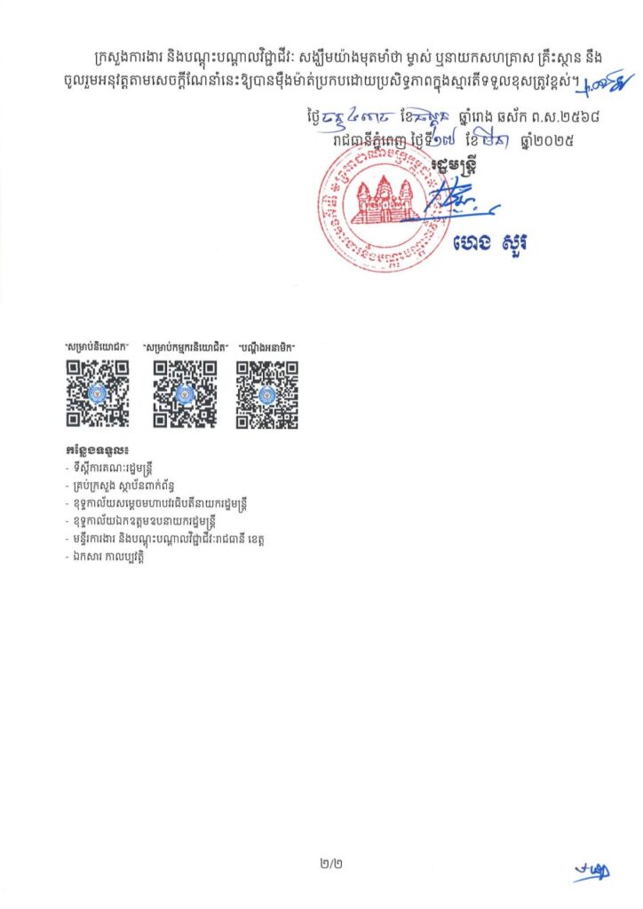 ក្រសួងការងារ និងបណ្តុះបណ្តាលវិជ្ជាជីវៈ សង្ឃឹមយ៉ាងមុតមាំថា ម្ចាស់ ឬនាយកសហគ្រាស គ្រឹះស្ថាន នឹង ចូលរួមអនុវត្តតាមសេចក្ដីណែនាំនេះឱ្យបានម៉ឺងម៉ាត់ប្រកបដោយប្រសិទ្ធភាពក្នុងស្មារតីទទួលខុសត្រូវខ្ពស់៕ រក្សាសិទ្ធដោយ៖សុទ្ធលី