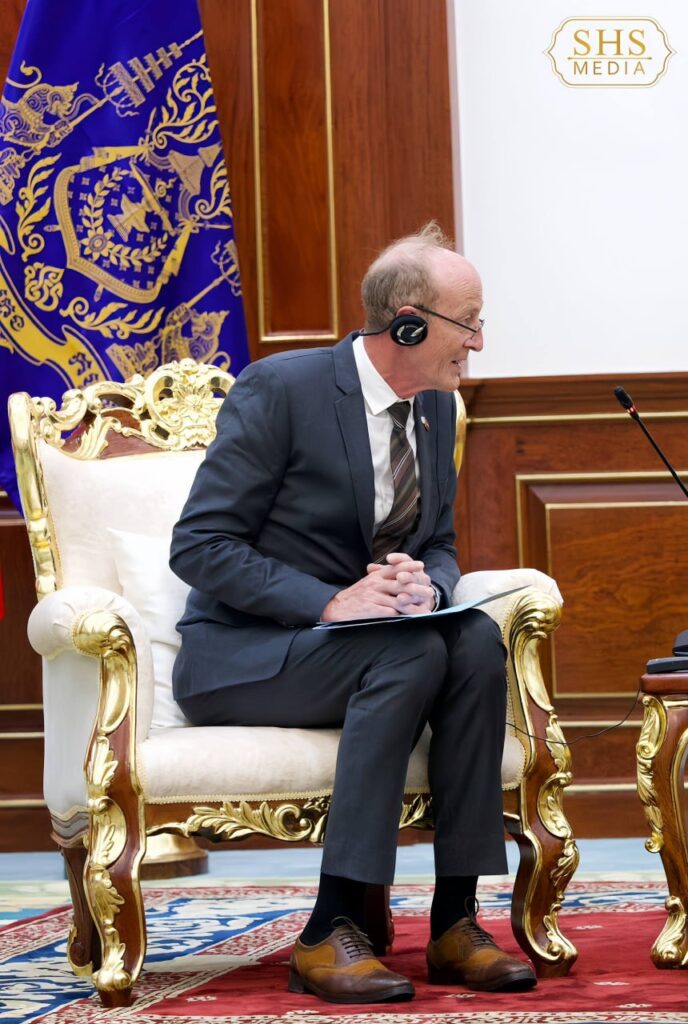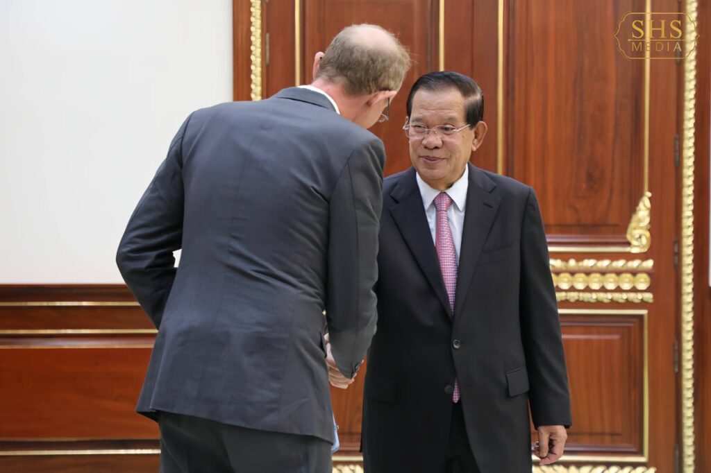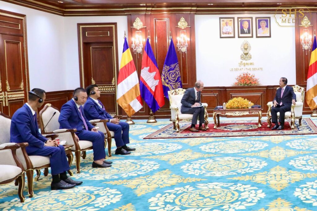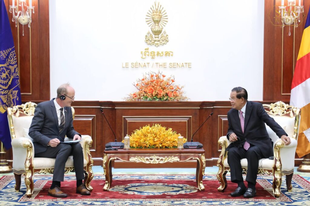 ភ្នំពេញ ៖ នៅវិមានសាមគ្គីភាព នៃព្រឹទ្ធសភា នាព្រឹកថ្ងៃព្រហស្បតិ៍ ២រោច ខែផល្គុន ឆ្នាំម្សាញ់ សប្តស័ក ពុទ្ធសករាជ ២៥៦៩ ត្រូវនឹងថ្ងៃទី៥ ខែមីនា ឆ្នាំ២០២៦ សម្តេចអគ្គមហាសេនាបតីតេជោ ហ៊ុន សែន ប្រមុខរដ្ឋស្តីទីនៃព្រះរាជាណាចក្រកម្ពុជា បានអនុញ្ញាតឱ្យ លោក ភីតធឺ អាល់មែន (Peter Altmann) សមាជិកក្រុមប្រឹក្សាភិបាលនៃគណបក្ស AfD មូលដ្ឋាន ប្រចាំទីក្រុង Karlsruhe ប្រទេសអាល្លឺម៉ង់ ចូលជួប សម្ដែងការគួរសម និងពិភាក្សាការងារ។