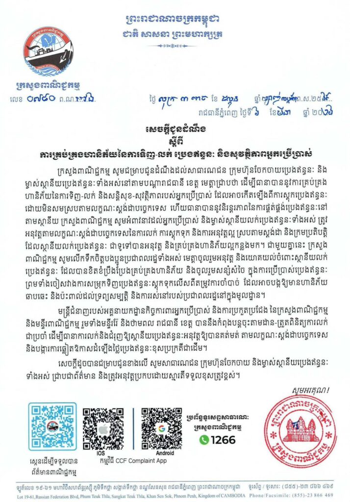 ក្រសួងពាណិជ្ជកម្មសូមជម្រាបជូនដំណឹងដល់សាធារណជន ក្រុមហ៊ុនចែកចាយប្រេងឥន្ធនៈ និង ម្ចាស់ស្ថានីយប្រេងឥន្ធនៈទាំងអស់នៅតាមបណ្តារាជធានី ខេត្ត មេត្តាជ្រាបថា ដើម្បីធានាបាននូវការគ្រប់គ្រង ហានិភ័យនៃការទិញ-លក់ និងសន្តិសុខ-សុវត្ថិភាពរបស់អ្នកប្រើប្រាស់ ដែលអាចកើតឡើងពីការស្តុកប្រេងឥន្ធនៈ ដោយមិនសមស្របតាមលក្ខណៈស្តង់ដាបច្ចេកទេស ហើយធានាបាននូវនិរន្តរភាពនៃការផ្គត់ផ្គង់ប្រេងឥន្ធនៈនៅ តាមស្ថានីយ ក្រសួងពាណិជ្ជកម្ម សូមអំពាវនាវដល់អ្នកប្រើប្រាស់ និងម្ចាស់ស្ថានីយលក់ប្រេងឥន្ធនៈទាំងអស់ ត្រូវ អនុវត្តតាមលក្ខណៈស្តង់ដាបច្ចេកទេសនៃការលក់ ការស្តុកទុក និងការអនុវត្តល្អ ស្របតាមស្តង់ដា និងក្រមប្រតិបត្តិ ដែលស្ថានីយលក់ប្រេងឥន្ធនៈ ជាទូទៅបានអនុវត្ត និងគ្រប់គ្រងហានិភ័យល្អកន្លងមក។