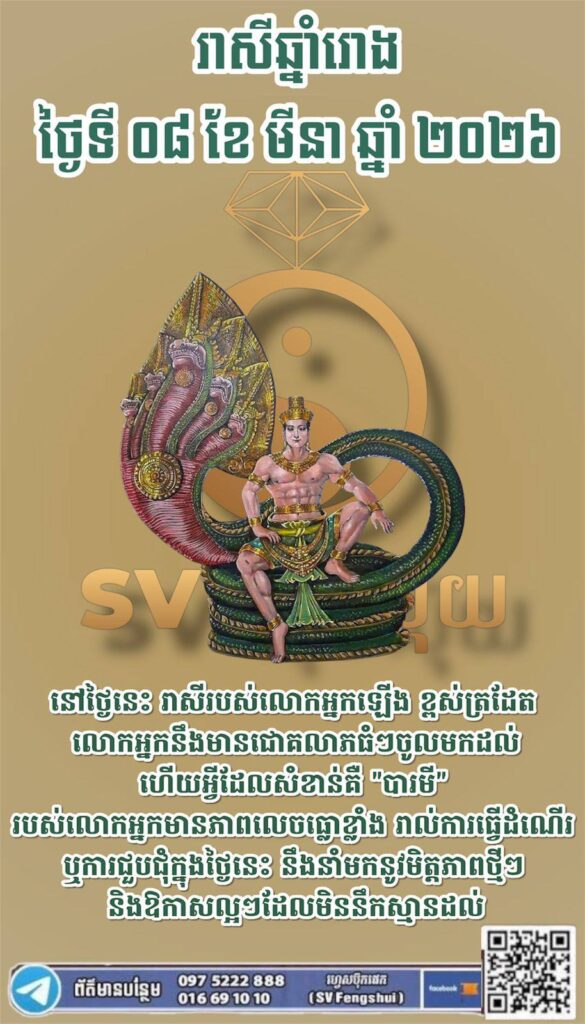 នៅថ្ងៃនេះ រាសីរបស់លោកអ្នកឡើង ខ្ពស់ត្រដែត។ លោកអ្នកនឹងមានជោគលាភធំៗចូលមកដល់ ហើយអ្វីដែលសំខាន់គឺ “បារមី” របស់លោកអ្នកមានភាពលេចធ្លោខ្លាំង។ រាល់ការធ្វើដំណើរ ឬការជួបជុំក្នុងថ្ងៃនេះ នឹងនាំមកនូវមិត្តភាពថ្មីៗ និងឱកាសល្អៗដែលមិននឹកស្មានដល់។