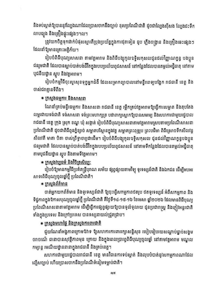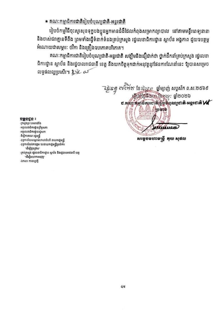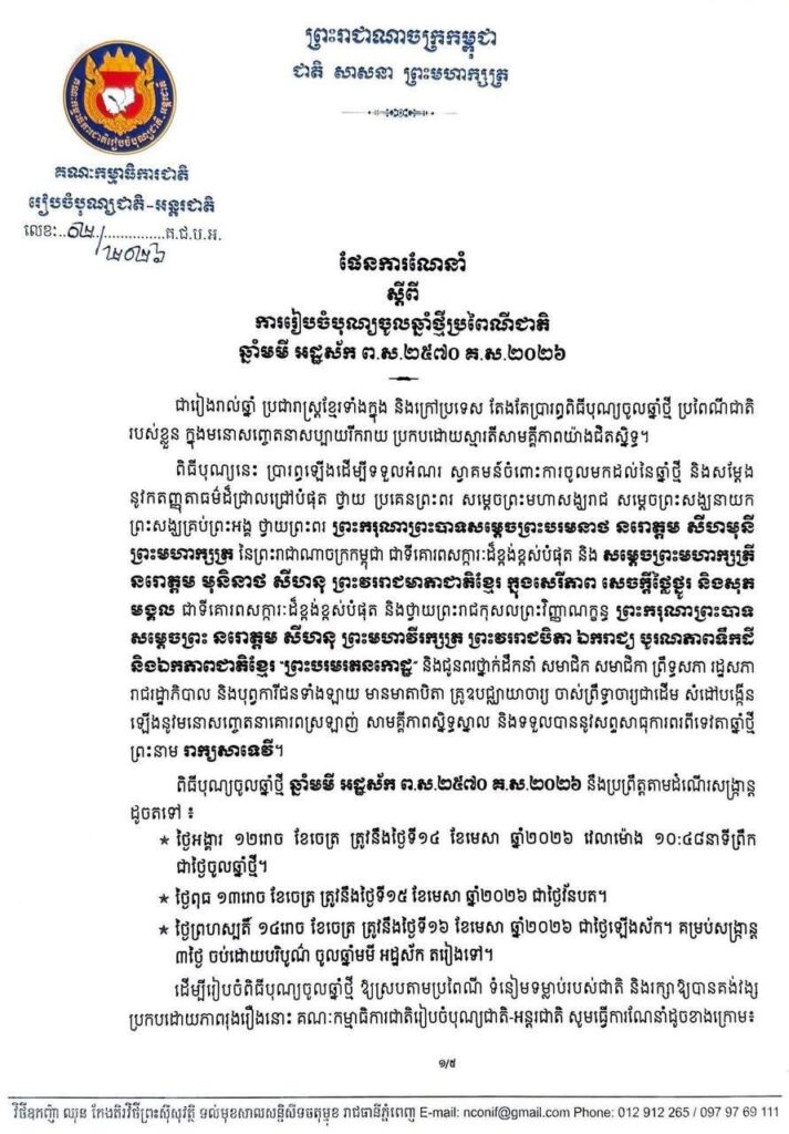 គណៈកម្មាធិការជាតិរៀបចំបុណ្យជាតិ-អន្តរជាតិ បានចេញផែនការណែនាំស្តីពីការរៀបចំបុណ្យចូលឆ្នាំថ្មី ប្រពៃណីជាតិ ឆ្នាំមមី អដ្ឋស័ក ព.ស.២៥៧០ គ.ស.២០២៦។ នេះបើតាមសេចក្តីណែនាំដែលទទួលបាននៅថ្ងៃទី០៩ ខែមីនា ឆ្នាំ២០២៦ ។