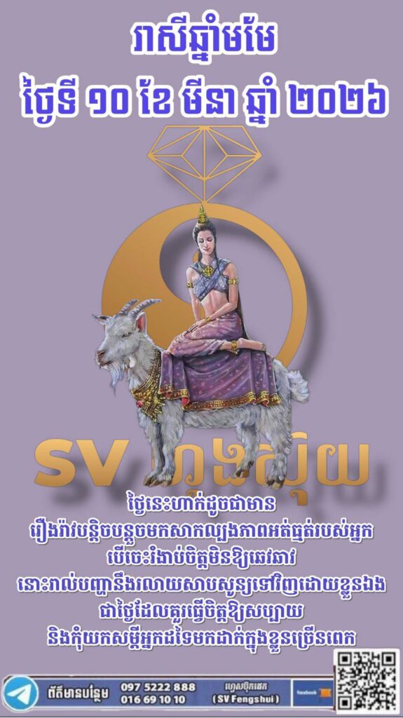 ថ្ងៃនេះហាក់ដូចជាមានរឿងរ៉ាវបន្តិចបន្តួចមកសាកល្បងភាពអត់ធ្មត់របស់អ្នក។ បើចេះរំងាប់ចិត្តមិនឱ្យឆេវឆាវ នោះរាល់បញ្ហានឹងរលាយសាបសូន្យទៅវិញដោយខ្លួនឯង។ ជាថ្ងៃដែលគួរធ្វើចិត្តឱ្យសប្បាយ និងកុំយកសម្តីអ្នកដទៃមកដាក់ក្នុងខ្លួនច្រើនពេក។