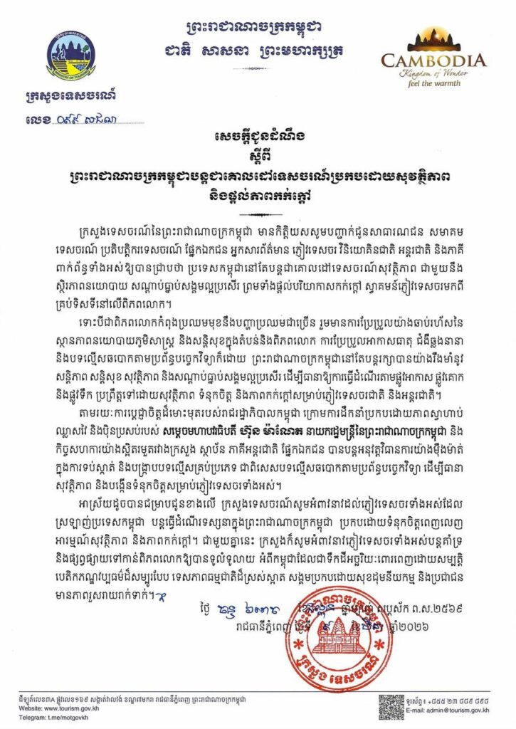 ភ្នំពេញ ៖ ក្រសួងទេសចរណ៍នៃព្រះរាជាណាចក្រកម្ពុជា សូមបញ្ជាក់ជូនសាធារណជន សមាគម ទេសចរណ៍ ប្រតិបត្តិករទេសចរណ៍ ផ្នែកឯកជន អ្នកសារព័ត៌មាន ភ្ញៀវទេសចរ វិនិយោគិនជាតិ អន្តរជាតិ និងភាគី ពាក់ព័ន្ធទាំងអស់ឱ្យបានជ្រាបថា ប្រទេសកម្ពុជានៅតែបន្តជាគោលដៅទេសចរណ៍សុវត្ថិភាព ជាមួយនឹង ស្ថិរភាពនយោបាយ សណ្តាប់ធ្នាប់សង្គមល្អប្រសើរ ព្រមទាំងផ្តល់បរិយាកាសកក់ក្ដៅ ស្វាគមន៍ភ្ញៀវទេសចរមកពី គ្រប់ទិសទីនៅលើពិភពលោក។