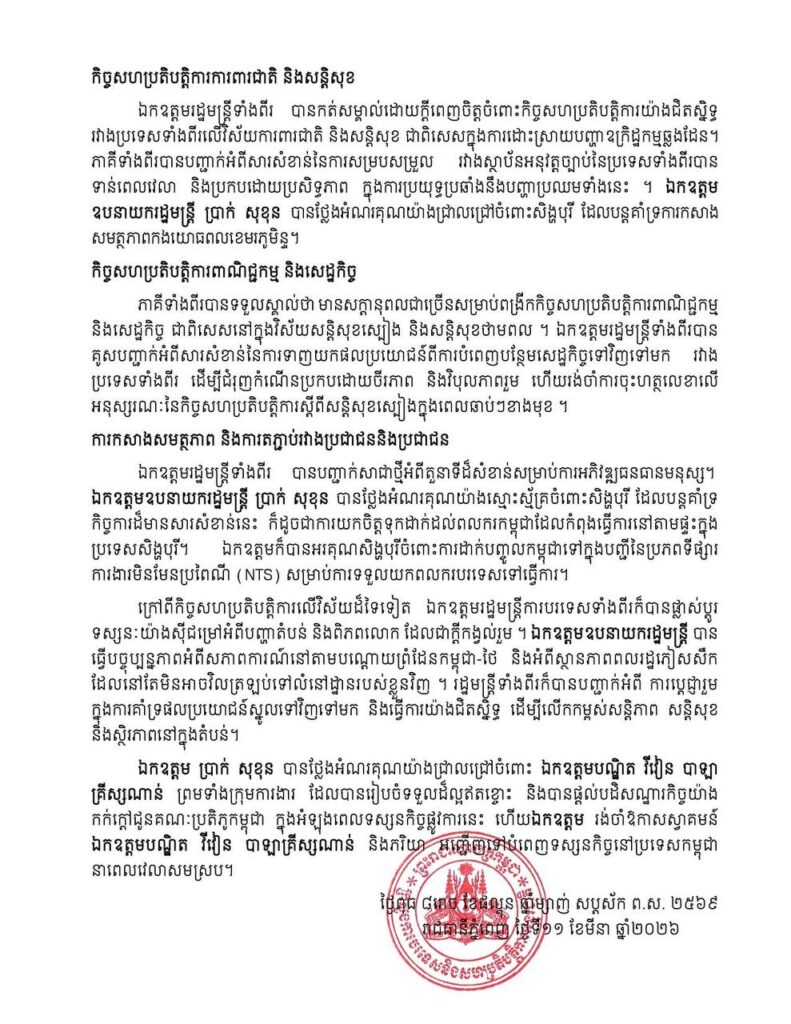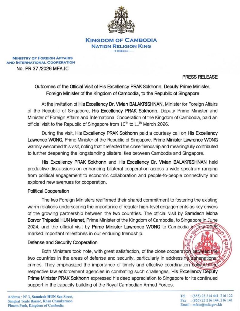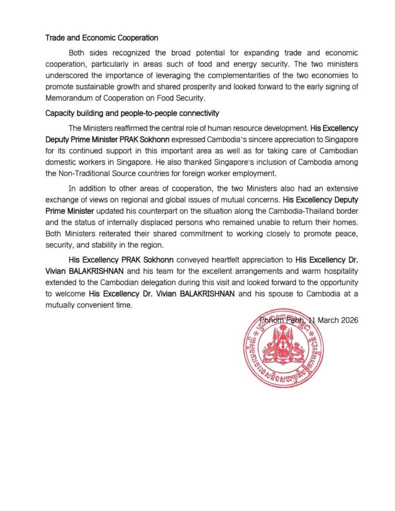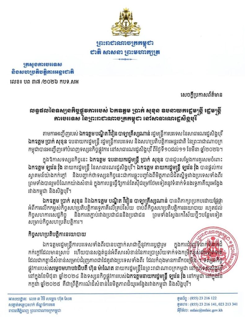 តាមការអញ្ជើញរបស់ ឯកឧត្តម បណ្ឌិត វីវៀន បាឡាគីស្សណាន់ រដ្ឋមន្ត្រីការបរទេស នៃសាធារណរដ្ឋសិង្ហបុរី ឯកឧត្តម ប្រាក់ សុខុន ឧបនាយករដ្ឋមន្ត្រី រដ្ឋមន្ត្រីការបរទេស និងសហប្រតិបត្តិការអន្តរជាតិ នៃព្រះរាជាណាចក្រ កម្ពុជាបានអញ្ជើញទៅបំពេញទស្សនកិច្ចផ្លូវការ នៅសាធារណរដ្ឋសិង្ហបុរី ពីថ្ងៃទី១០ដល់១១ ខែមីនា ឆ្នាំ២០២៦។ ក្នុងឱកាសទស្សនកិច្ចនេះ ឯកឧត្តម ឧបនាយករដ្ឋមន្ត្រី ប្រាក់ សុខុន បានជួបសម្តែងការគួរសមចំពោះ ឯកឧត្តម ឡរ៉េន វ៉ុង នាយករដ្ឋមន្ត្រី នៃសាធារណរដ្ឋសិង្ហបុរី។