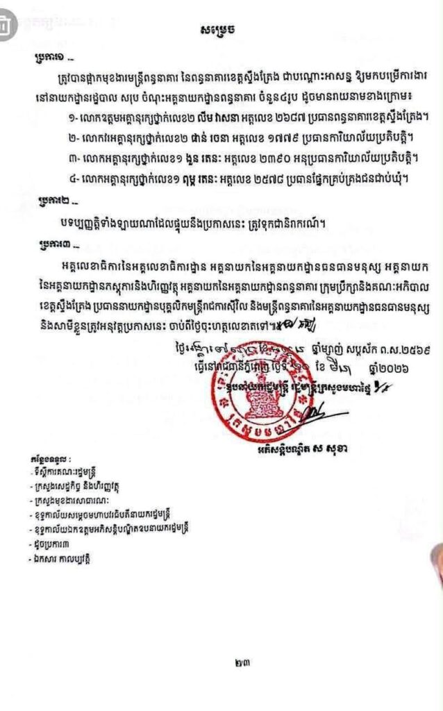 ត្រូវបានផ្អាកមុខងារមន្ត្រីពន្ធនាគារ នៃពន្ធនាគារខេត្តស្ទឹងត្រែង ជាបណ្តោះអាសន្ន ឱ្យមកបម្រើការងារ នៅនាយកដ្ឋានរដ្ឋបាលសរុប ចំណុះអគ្គនាយកដ្ឋានពន្ធនាគារ ចំនួន៤រូប ដូចមានរាយនាមខាងក្រោម៖