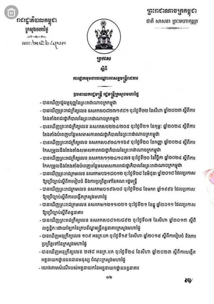 ភ្នំពេញ ៖ ក្រសួងមហាផ្ទៃនៃរាជរដ្ឋភិបាលកម្ពុជា បានចេញប្រកាសស្តីពី ការផ្អាកមុខងារបណ្ដោះអាសន្នមន្ត្រីរាជការ។ យោងតាមសំណើរបស់អគ្គនាយកនៃអគ្គនាយកដ្ឋានពន្ធនាគារ សម្រេច៖