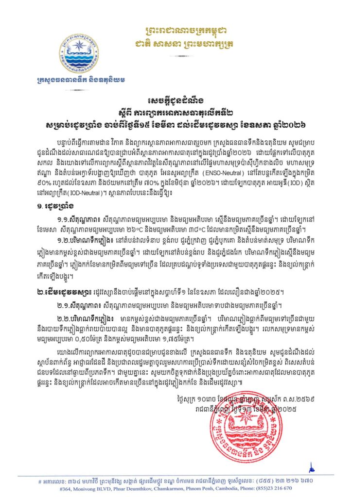ភ្នំពេញ ៖ បន្ទាប់ពីធ្វើការតាមដាន វិភាគ និងព្យាករស្ថានភាពអាកាសធាតុរួចមក ក្រសួងធនធានទឹកនិងឧតុនិយម សូមជម្រាប ជូនដំណឹងដល់សាធារណជនឱ្យបានជ្រាបអំពីស្ថានភាពអាកាសធាតុនៅក្នុងរដូវប្រាំងឆ្នាំ២០២៦ ដោយផ្អែកទៅលើបាតុភូត សកល និងយោងទៅលើការព្យាករស្តីពីស្ថានភាពវិវត្តនៃសីតុណ្ហភាពនៅលើផ្ទៃមហាសមុទ្រប៉ាស៊ីហ្វិកខាងលិច មហាសមុទ្រ ឥណ្ឌា និងតំបន់អេក្វាទ័របង្ហាញឱ្យឃើញថា បាតុភូត អែនសូអព្យាក្រឹត (ENSO-Neutral) នៅតែបន្តកើតឡើងក្នុងកម្រិត ៩០% រហូតដល់ខែឧសភា និងថយមកនៅត្រឹម ៧០% ក្នុងខែមិថុនា ឆ្នាំ២០២៦។ ដោយឡែកបាតុភូត អាយអូឌី(ICD) ស្ថិត នៅអព្យាក្រឹត(IOD-Neutral)។ ស្ថានភាពបែបនេះនឹងធ្វើឱ្យ៖