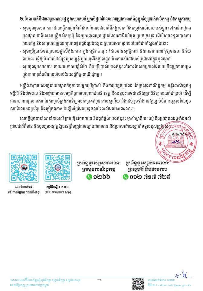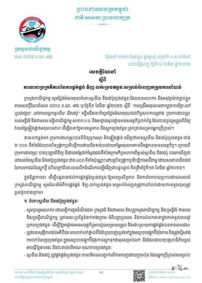 រាជធានីភ្នំពេញ ៖ ក្រសួងពាណិជ្ជកម្ម នៅថ្ងៃទី១៤ ខែមីនា ឆ្នាំ២០២៦ បានចេញសេចក្ដីណែនាំ ស្តីពី