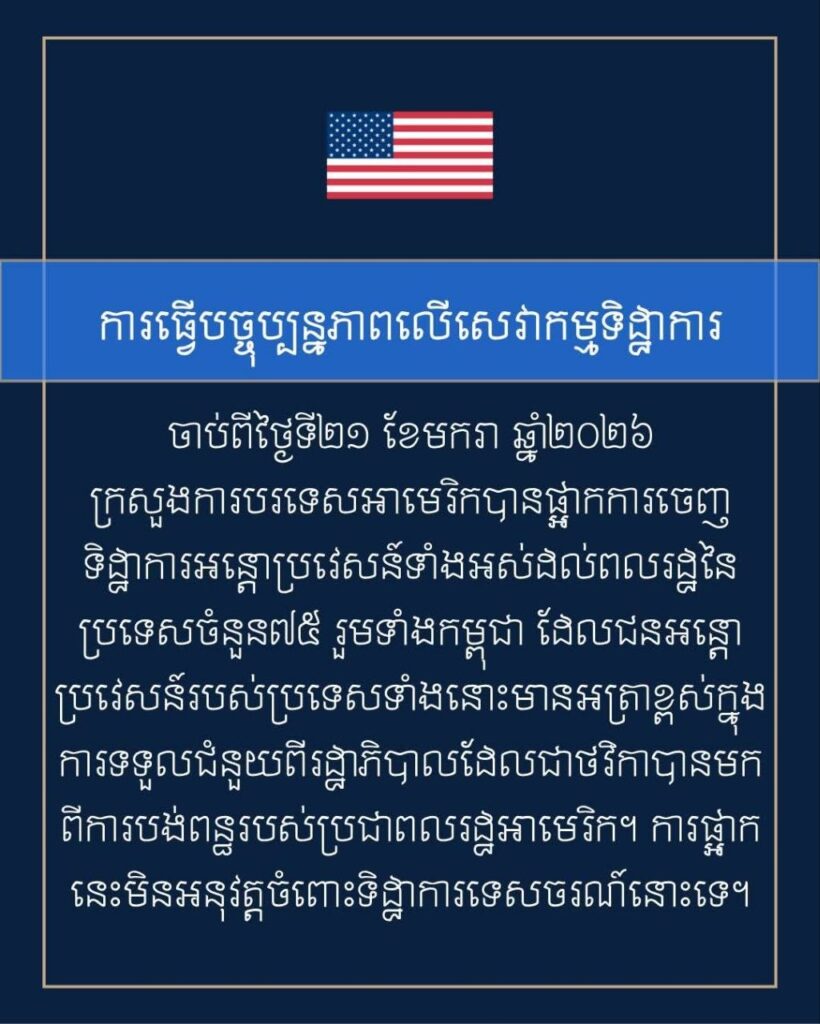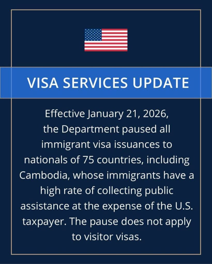 ភ្នំពេញ៖ ស្ថានសហរដ្ឋអាមេរិកប្រចាំកម្ពុជា នៅថ្ងៃទី១៦ខែមីនាឆ្នាំ២០២៦នេះ បានចេញផ្សាយព័ត៌មានឲ្យដឹងថា ក្រសួងការបរទេសអាមេរិក បានផ្អាកការចេញទិដ្ឋាការអន្តោប្រវេសន៍ទាំងអស់សម្រាប់ពលរដ្ឋមកពីប្រទេសដែលមានហានិភ័យខ្ពស់ក្នុងការប្រើប្រាស់ផលប្រយោជន៍សាធារណៈរបស់រដ្ឋាភិបាលអាមេរិក។