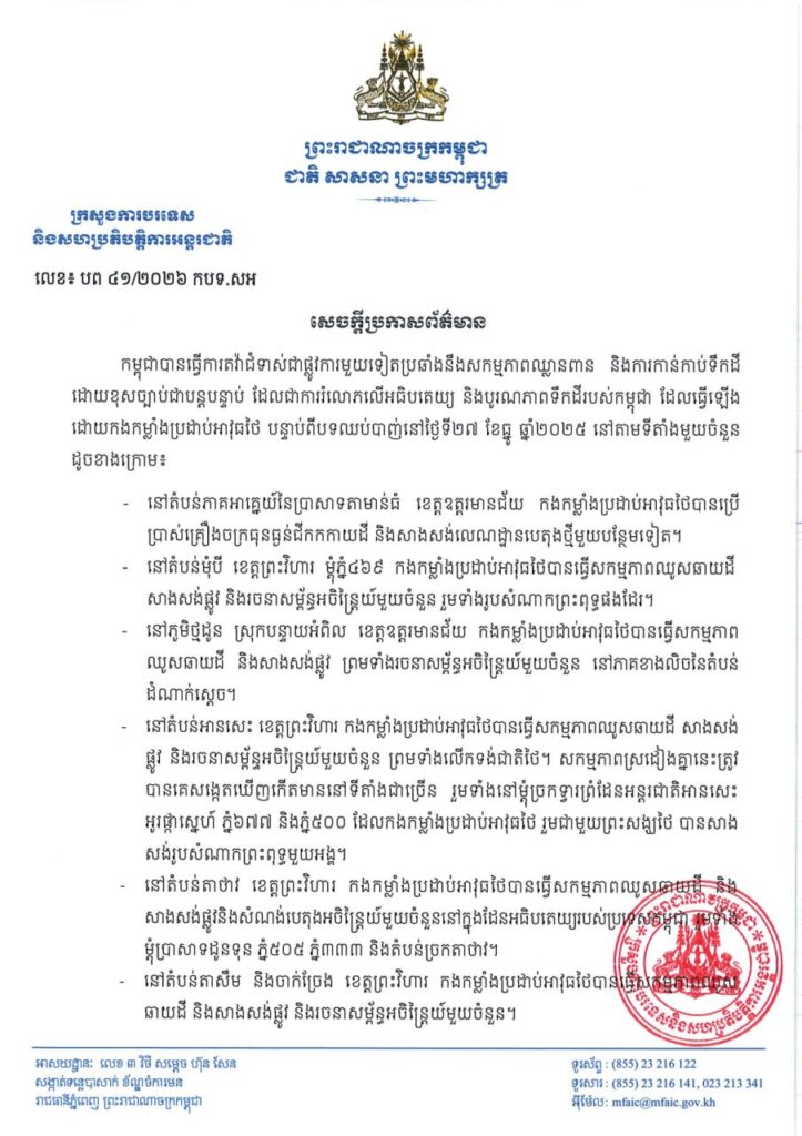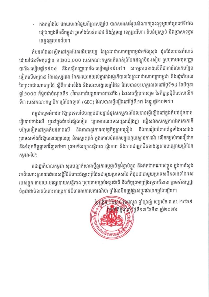 តំបន់ទាំងនេះស្ថិតនៅក្នុងដែនអធិបតេយ្យ នៃព្រះរាជាណាចក្រកម្ពុជាទាំងស្រុង ដូចដែលបានកំណត់ ដោយផែនទីមាត្រដ្ឋាន ១:២០០.០០០ របស់គណៈកម្មការកំណត់ព្រំដែនឥណ្ឌូចិន-សៀម ស្របតាមអនុសញ្ញា បារាំង-សៀមឆ្នាំ១៩០៤ និងសន្ធិសញ្ញាបារាំង-សៀមឆ្នាំ១៩០៧ សកម្មភាពខាងលើគឺជាការរំលោភបន្ថែម ទៀតលើមាត្រា៥ នៃអនុស្សរណៈនៃការយោគយល់គ្នារវាងរដ្ឋាភិបាលនៃព្រះរាជាណាចក្រកម្ពុជា និងរដ្ឋាភិបាល នៃព្រះរាជាណាចក្រថៃ ស្តីពីការវាស់វែង និងបោះបង្គោលព្រំដែន ដែលបានចុះហត្ថលេខានៅថ្ងៃទី១៤ ខែមិថុនា ឆ្នាំ២០០០ ក៏ដូចជាចំណុចទី១ (វិធានកាត់បន្ថយភាពតានតឹង) នៃសេចក្ដីប្រកាសរួម នៃកិច្ចប្រជុំពិសេសលើក ទី៣ របស់គណៈកម្មាធិការព្រំដែនទូទៅ (GBC) ដែលបានធ្វើឡើងនៅថ្ងៃទី២៧ ខែធ្នូ ឆ្នាំ២០២៥។