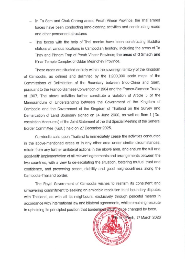 ភ្នំពេញ ៖ ក្រសួងការបរទេស និងសហប្រតិបត្តិការអន្តរជាតិនៅថ្ងៃទី១៧ ខែមីនា ឆ្នាំ២០២៦បានចេញសេចក្តីប្រកាសព័ត៌មានឲ្យដឹងថាកម្ពុជាបានធ្វើការតវ៉ាជំទាស់ជាផ្លូវការមួយទៀតប្រឆាំងនឹងសកម្មភាពឈ្លានពាន និងការកាន់កាប់ទឹកដី ដោយខុសច្បាប់ជាបន្តបន្ទាប់ ដែលជាការរំលោភលើអធិបតេយ្យ និងបូរណភាពទឹកដីរបស់កម្ពុជា ដែលធ្វើឡើង ដោយកងកម្លាំងប្រដាប់អាវុធថៃ បន្ទាប់ពីបទឈប់បាញ់នៅថ្ងៃទី២៧ ខែធ្នូ ឆ្នាំ២០២៥ នៅតាមទីតាំងមួយចំនួន ដូចខាងក្រោម៖