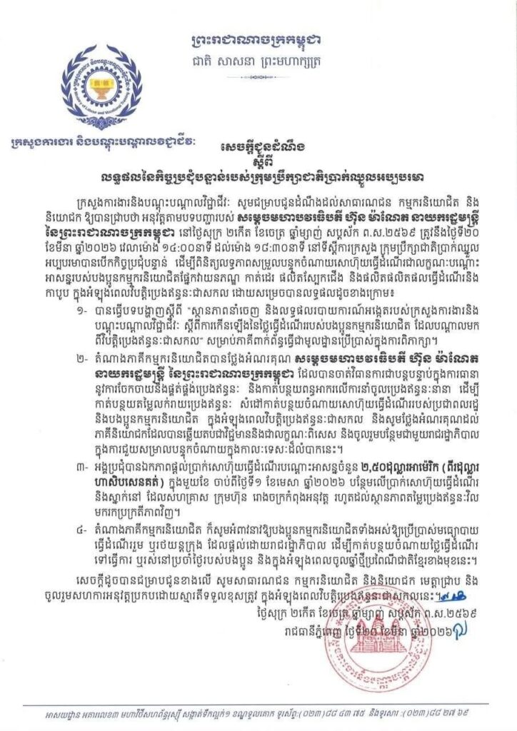 ភ្នំពេញ ៖ សេចក្តីជូនដំណឹងរបស់ ក្រសួងការងារ និងបណ្តុះបណ្តាលវិជ្ជាជីវៈ ស្តីពី លទ្ធផលនៃកិច្ចប្រជុំបន្ទាន់របស់ក្រុមប្រឹក្សាជាតិប្រាក់ឈ្នួលអប្បបរមា ដោយបានឯកភាពផ្តល់ប្រាក់សោហ៊ុយធ្វើដំណើរបណ្តោះអាសន្នចំនួន ២,៥០ដុល្លារអាម៉េរិក (ពីរដុល្លារហាសិបសេន) ក្នុងមួយខែ ចាប់ពីថ្ងៃទី១ ខែមេសា ឆ្នាំ២០២៦ បន្ថែមលើប្រាក់សោហ៊ុយធ្វើដំណើរនិងស្នាក់នៅ ដែលសហគ្រាស ក្រុមហ៊ុន រោងចក្រកំពុងអនុវត្ត រហូតដល់ស្ថានភាពតម្លៃប្រេងឥន្ធនៈវិលមករកប្រក្រតីភាពវិញ៕ រក្សាសិទ្ធដោយ៖សុទ្ធលី