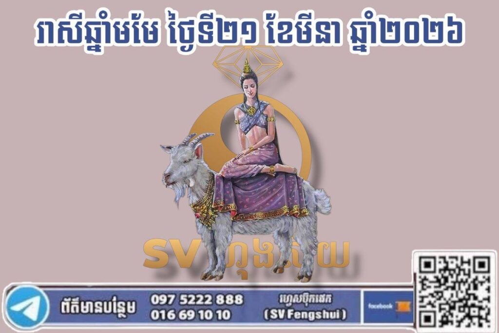ថ្ងៃនេះគឺជាថ្ងៃដ៏មានសិរីសួស្ដីសម្រាប់អ្នកកើតឆ្នាំមមែ។ លោកអ្នកនឹងមានអារម្មណ៍ថាស្រស់ស្រាយ មានពន្លឺក្នុងចិត្ត និងទទួលបានការរាប់អានស្រឡាញ់ចូលចិត្តពីមនុស្សជុំវិញខ្លួនយ៉ាងខ្លាំង។ រាល់ការប្រាថ្នាចង់បានអ្វីមួយ ហាក់ដូចជាមានជោគជ័យខ្ពស់។