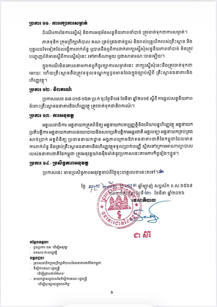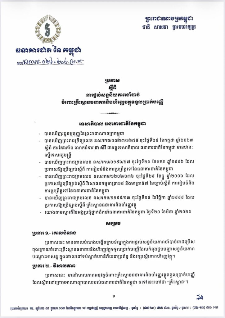 ធនាគារជាតិនៃកម្ពុជា ដាក់ចេញប្រកាសលេខ ធ៣៧.០២៦.២០៤ ប្រ.ក ចុះថ្ងៃទី២០ ខែមីនា ឆ្នាំ២០២៦ ស្តីពី ការផ្តល់សន្ទនីយភាពចាំបាច់ចំពោះគ្រឹះស្ថានធនាគារនិងហិរញ្ញវត្ថុទទួលប្រាក់បញ្ញើ ឱ្យប្រើប្រាស់ជំនួសប្រកាសលេខ ធ៧-០១៥-១៥៣ ប្រ.ក ចុះថ្ងៃទី១៧ ខែមីនា ឆ្នាំ២០១៥ ស្តីពី ការផ្តល់សន្ទនីយភាពចំពោះគ្រឹះស្ថានធនាគារនិងហិរញ្ញវត្ថុ។