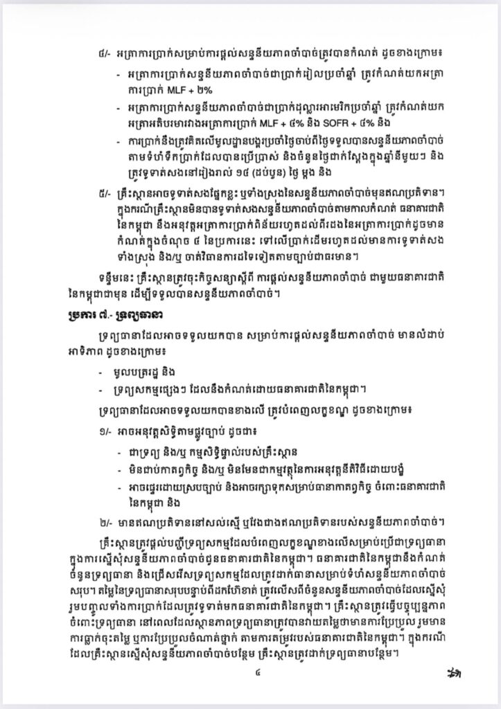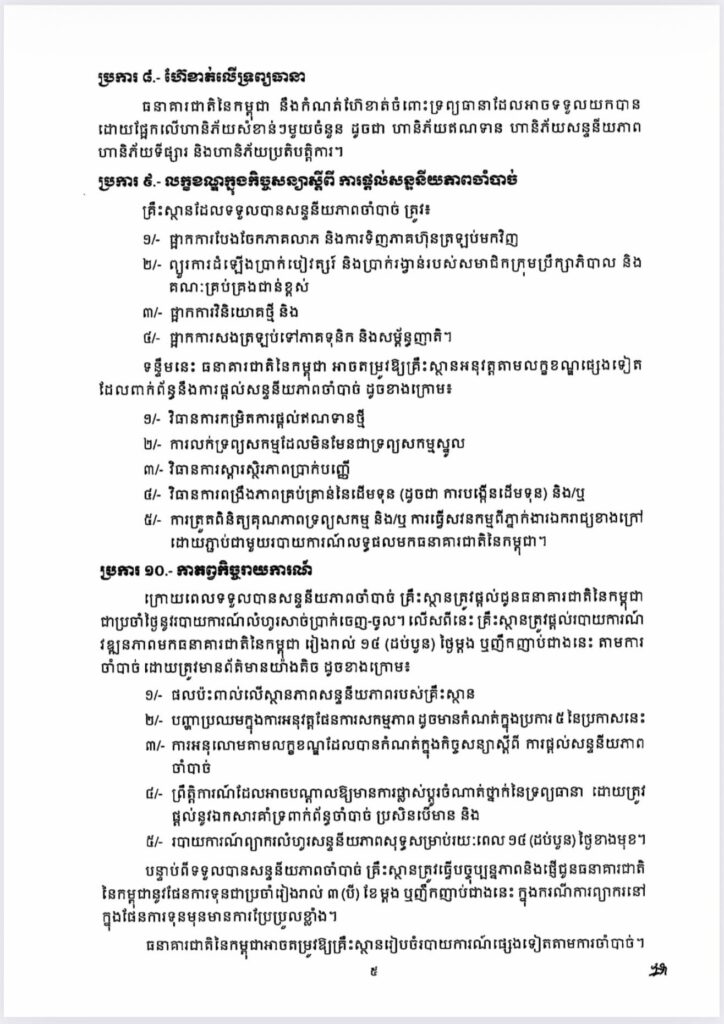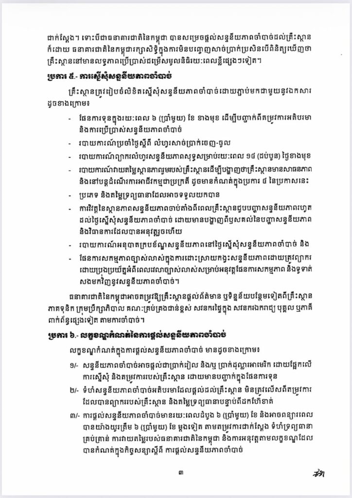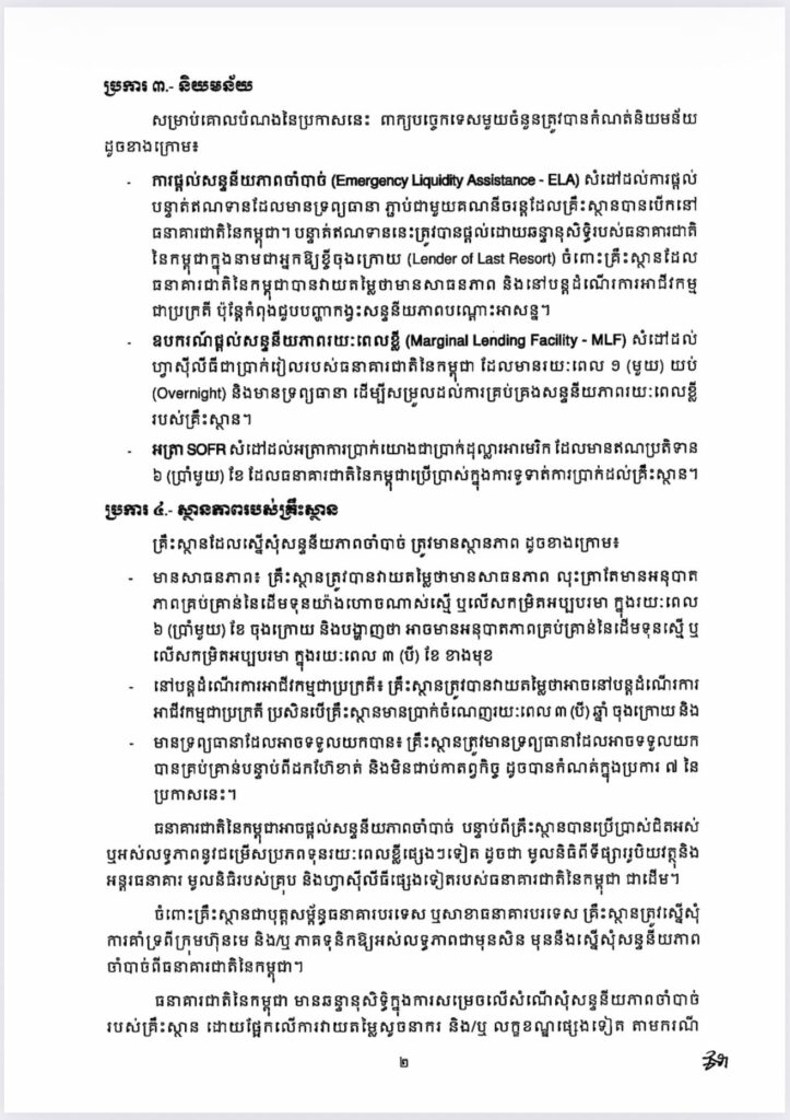 ប្រកាសនេះអនុញ្ញាតឱ្យគ្រឹះស្ថានធនាគារនិងហិរញ្ញវត្ថុទទួលប្រាក់បញ្ញើដែលកំពុងជួបបញ្ហាសន្ទនីយភាពបណ្ដោះអាសន្ន ស្នើសុំសន្ទនីយភាពចាំបាច់ជាជម្រើសចុងក្រោយ ក្នុងគោលដៅទប់ស្កាត់ហានិភ័យជាប្រព័ន្ធ និងរក្សាស្ថិរភាពហិរញ្ញវត្ថុ។ ទន្ទឹមនេះ ក្រោមក្របខ័ណ្ឌនៃប្រកាសថ្មីនេះ ធនាគារជាតិនៃកម្ពុជា នឹងបន្តអនុវត្តតួនាទីជាអាជ្ញាធរអាណាព្យាបាល និងគាំទ្រស្ថិរភាពហិរញ្ញវត្ថុដោយធានាថា ការផ្តល់សន្ទនីយភាពចាំបាច់ ត្រូវបានអនុវត្តដោយប្រុងប្រយ័ត្ន មានលក្ខខណ្ឌច្បាស់លាស់ និងផ្អែកលើគោលការណ៍គ្រប់គ្រងហានិភ័យសម្រាប់ប្រព័ន្ធធនាគារទាំងមូល៕ រក្សាសិទ្ធដោយ៖សុទ្ធលី