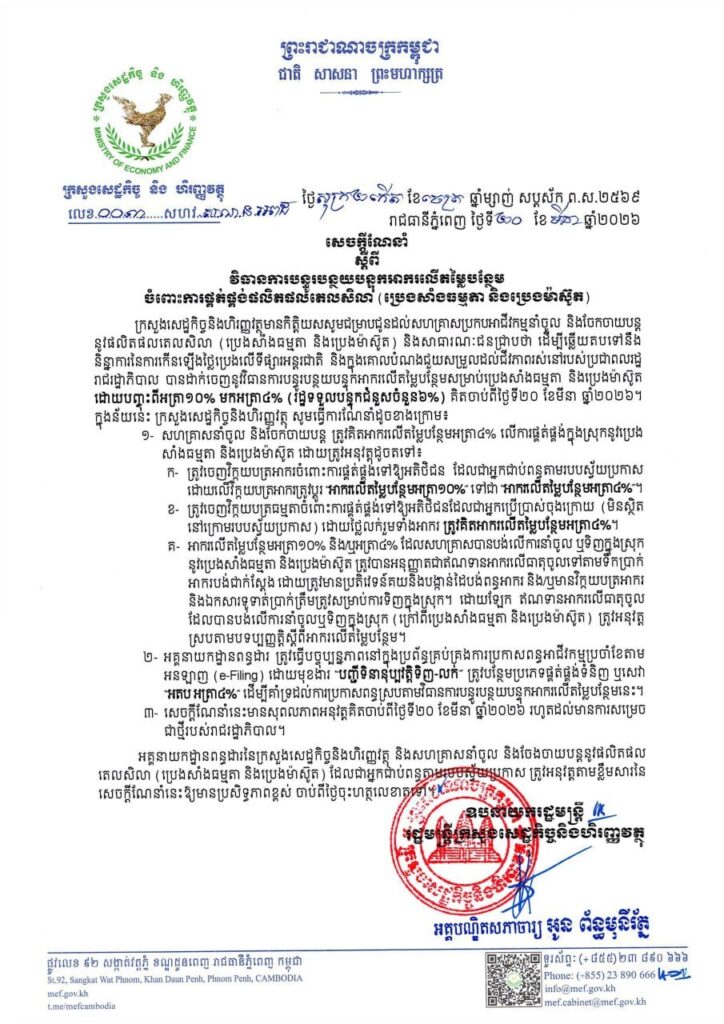 ក្រសួងសេដ្ឋកិច្ចនិងហិរញ្ញវត្ថុមានកិត្តិយសសូមជម្រាបជូនដល់សហគ្រាសប្រកបអាជីវកម្មនាំចូល និងចែកចាយបន្ត នូវផលិតផលតេលសិលា (ប្រេងសាំងធម្មតា និងប្រេងម៉ាស៊ូត) និងសាធារណៈជនជ្រាបថា ដើម្បីឆ្លើយតបទៅនឹង និន្នាការនៃការកើនឡើងថ្លៃប្រេងលើទីផ្សារអន្តរជាតិ និងក្នុងគោលបំណងជួយសម្រួលដល់ជីវភាពរស់នៅរបស់ប្រជាពលរដ្ឋ រាជរដ្ឋាភិបាល បានដាក់ចេញនូវវិធានការបន្ធូរបន្ថយបន្ទុក់អាករលើតម្លៃបន្ថែមសម្រាប់ប្រេងសាំងធម្មតា និងប្រេងម៉ាស៊ូត ដោយបញ្ចុះពីអត្រា១០% មកអត្រា៤% (រំដ្ឋទទួលបន្ទុកជំនួសចំនួន៦%) គិតចាប់ពីថ្ងៃទី២០ ខែមីនា ឆ្នាំ២០២៦។ ក្នុងន័យនេះ ក្រសួងសេដ្ឋកិច្ចនិងហិរញ្ញវត្ថុ សូមធ្វើការណែនាំដូចខាងក្រោម៖